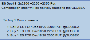 Are the CME exchange supported butterfly option products supported in Sierra Chart? https://www.cmegroup.com/confluence/display/EPICSANDBOX/Spreads+and+Combinations+Available+on+CME+Globex e.g. ES futures options, long 1 butterfly = Long 1x 3250 put Short 2x 3300 put Long 1x 3350 put I want to quote/trade this as 1 orderbook symbol with my orders hitting the exchange traded combo, not legging manually. e.g. on IBKR TWS I can quote the symbol and have it execute natively on Globex, see attachment. Is this supported? Date Time Of Last Edit: 2020-09-26 16:32:33