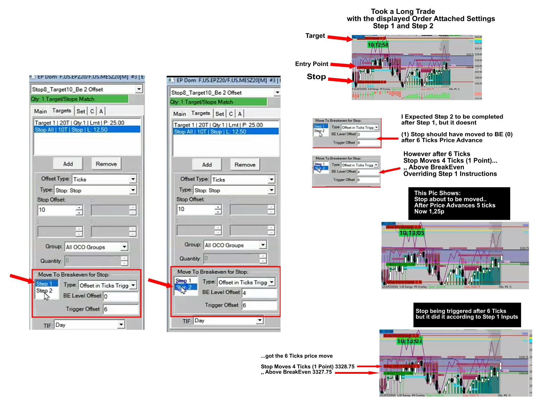 HI, I was testing the attached orders on demo and i was trying to achieve the following: These are just inputs i tried, to check if it worked the way i was thinking_ 1_I wanted the Stop to move to BE after 6 ticks Price advance (Step 1) (Offset in Ticks Triggered) 2_Then after a further 6 Ticks Price advance (Step 2) (Offset in Ticks Triggered) i wanted the Stop to be moved 4 Ticks from/past the BE After Step 1 happened, i was expecting Step 2 to be activated but it didnt work, as i saw that the (Step 2 Inputs/ 6-4) came in before the (Step 1 Inputs/6-0)) Obviously i must have failed in my interpretation of the terminology of the instructions and wonder if it is possible in simple words to describe what to do in order to achieve the above 2 Step I have been on it 3 days and i don't seem to get it right_ I don't try these settings on replay chart, as it replays me past taken trades, and it gets confusing, but i try them when the market it is open so i need to wait until it happens Help appreciated Many Thanks |