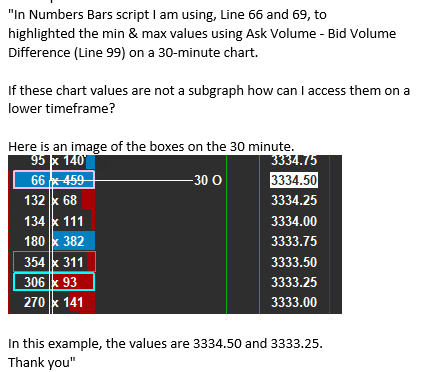 Also refer to: ACSIL Programming Concepts: Accessing Volume at Price Data Per Bar Sierra Chart Support - Engineering Level Your definitive source for support. Other responses are from users. Try to keep your questions brief and to the point. Be aware of support policy: https://www.sierrachart.com/index.php?l=PostingInformation.php#GeneralInformation For the most reliable, advanced, and zero cost futures order routing, *change* to the Teton service: Sierra Chart Teton Futures Order Routing |