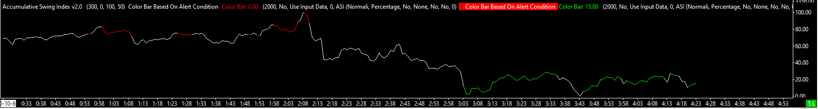 I am using the colour bar on alert to colour an indicator line when it is above 70 or below 30. The problem is that my indicator auto-adjusts to always show the current visible data in the ranged from 0 to 100. This means that the "normalisation" causes the historical values of the indicator to adjust. The problem I am facing is that the color bar indicator that I have added to color the line does not get adjusted and as a result I get a bit of a mess on my screen. The only way to fix it is to refresh the chart with the "insert" key. How can I get the color bar indicator to update correctly? I am attaching images of before and after a refresh. SC Version 2177 running. |