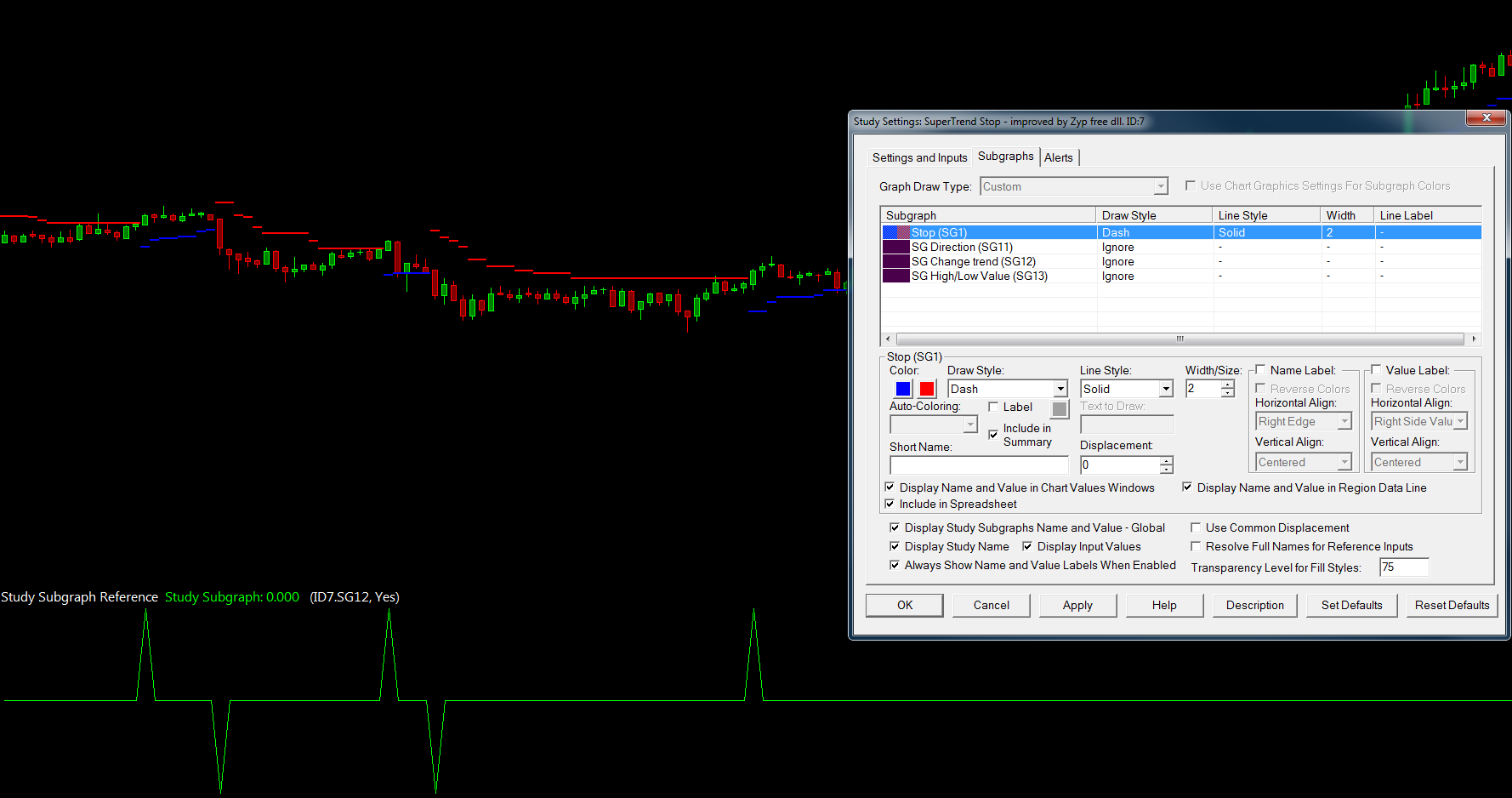 I would like to create and alert that is triggered when an indicator color is changed from red to green or from green to red. The indicator is called 'SuperTrend' (SierraChartStudies_64.scsf_SuperTrendStop), what is the alert condition I need to code? Thank you! |