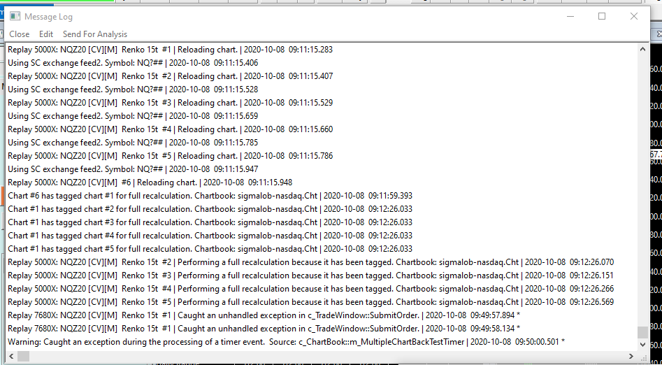 Hi SC, I have been facing an issue of sierra application crashing, which is partly resolved after you helped with the releasing of the dynamic memory declared by my custom study. However I am still getting an exception in the trade window and a timer event. Attaching the snap of that. Could you please tell me which functions should i look at in my custom study that might be causing these exceptions? |