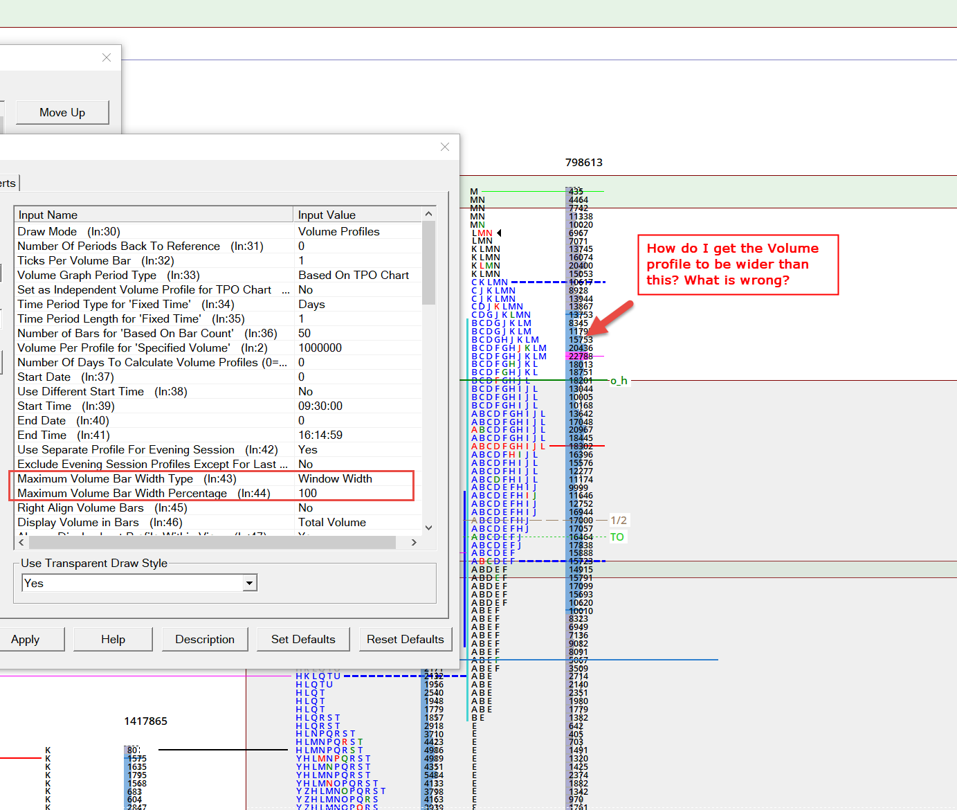 One of the things to check is if the option for Volume Profile Bars Length Relative to All Visible Profiles is set to Yes, as this can cause the bars to be smaller, depending on the values of other visible bars. Refer to the information here: Volume By Price Study: Volume Profile Bars Length Relative to All Visible Profiles Otherwise, the only way to control the width is to change the chart spacing. Refer to the information here: Working With Charts: Changing Bar Spacing For the most reliable, advanced, and zero cost futures order routing, use the Teton service: Sierra Chart Teton Futures Order Routing |