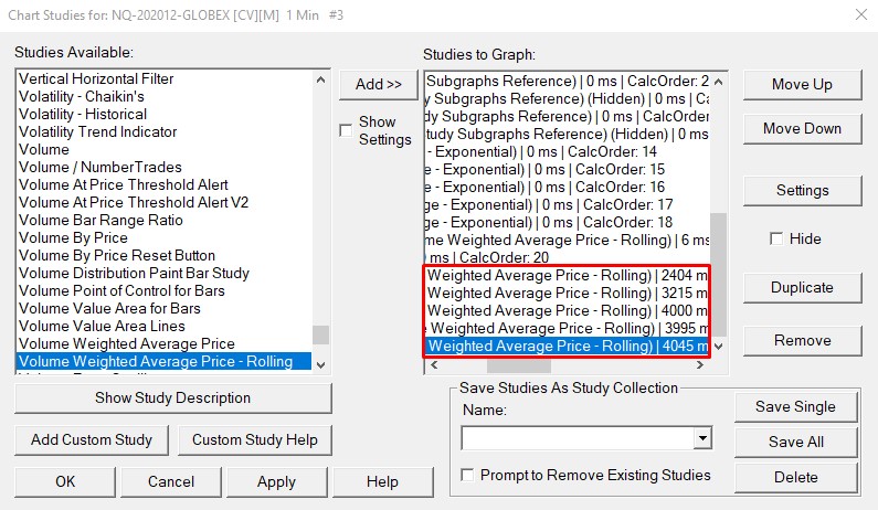 I am using the VWAP - Rolling study for 2, 3, 5, 7 and 30 days on a 1 min chart. The calculation time is very high - see screenshot. What do you recommend to reduce the calculation time? On a 15-min chart the calculation time is significantly better - the highest is 836 ms for the 30 days.