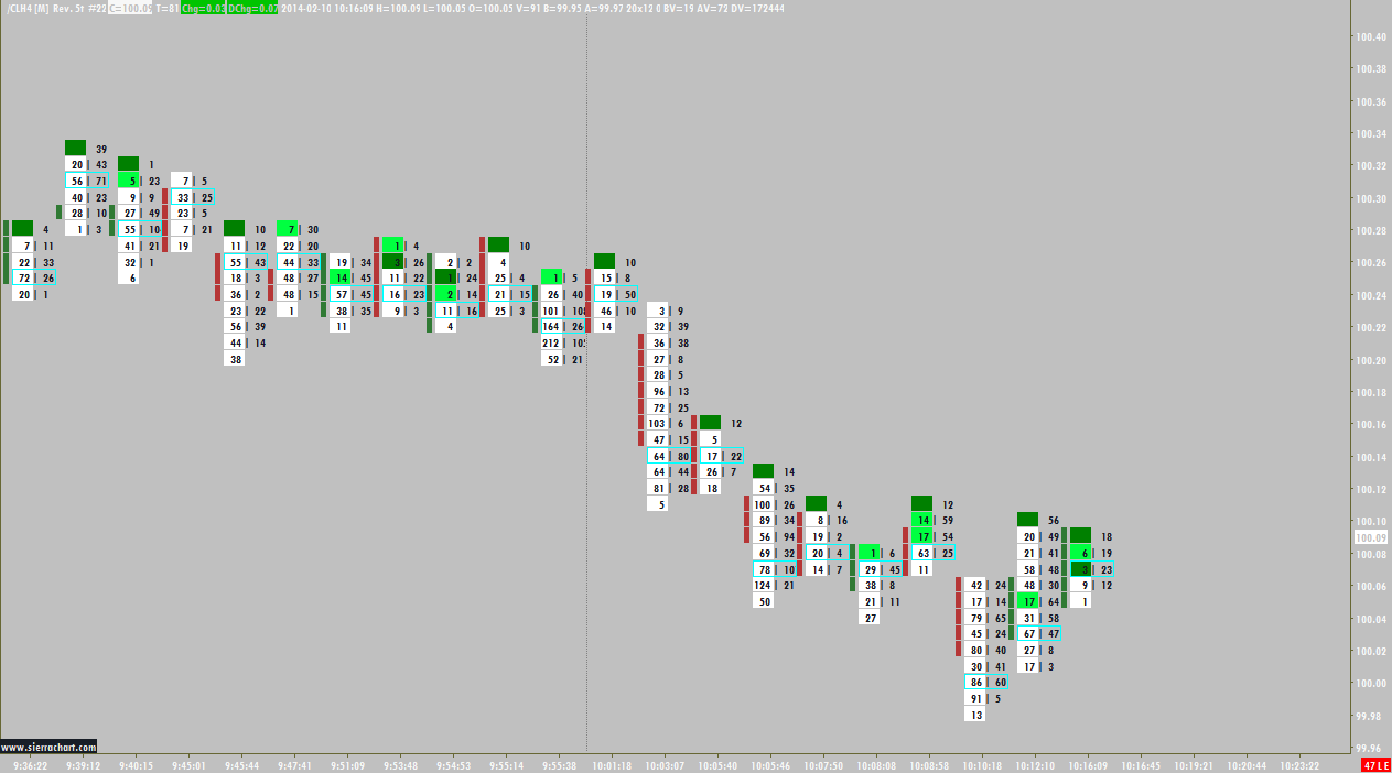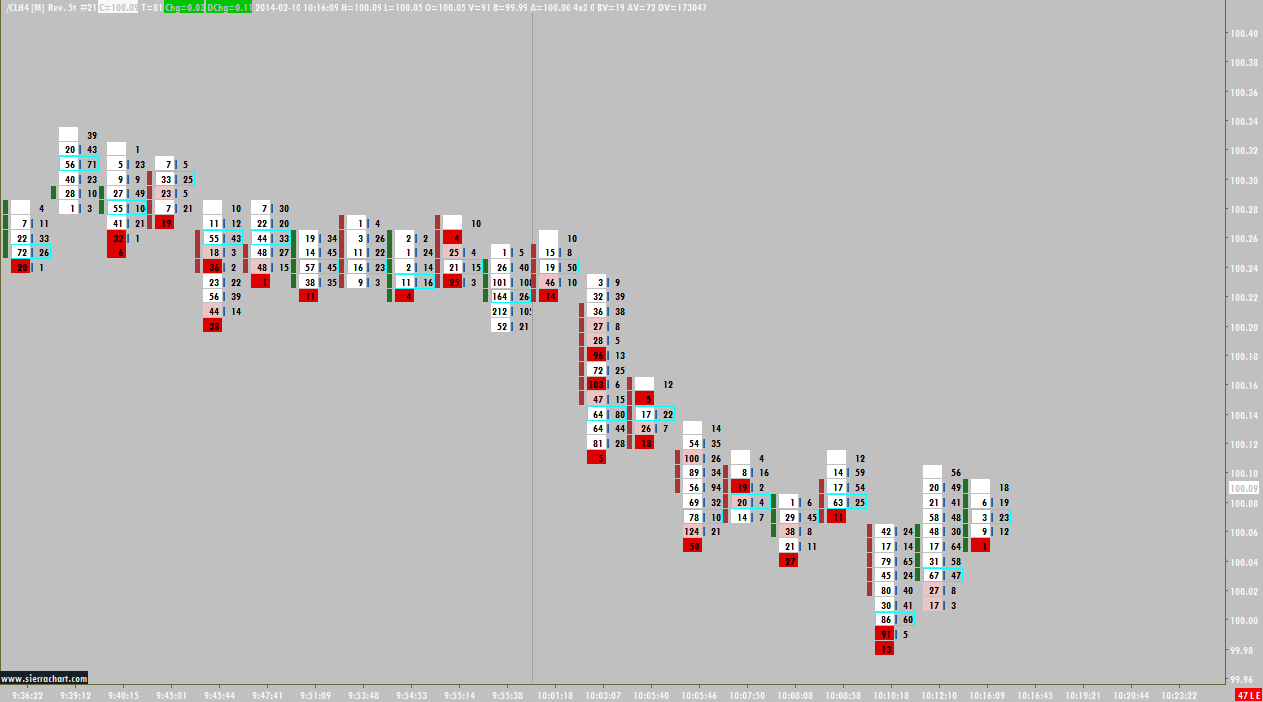 Numbers Bars - Dominant side issue I have sent the Message Log with the heading titled "Numbers Bars - Dominant side issue" In using the 'Background type' feature for the numbers bar study, I am using two different versions of the same study. One is working correctly, and the other - not. Chart settings appear to be consistent, with the difference being the emphasis on either Bid or Ask. I have been unable to get the dominant side on the chart (#2 below)to express correctly. see examples below. 1. Numbers Bars with Hitting the bid setting dominant, correctly showing red highlights on left column. http://www.sierrachart.com/image.php?l=1392058032128.png 2. Numbers Bars with Hitting the ask setting dominant, incorrectly showing green highlights on left column. http://www.sierrachart.com/image.php?l=1392057977225.png I have sent the Message Log with the heading titled "Numbers Bars - Dominant side issue" Thanks for the help. Blake |