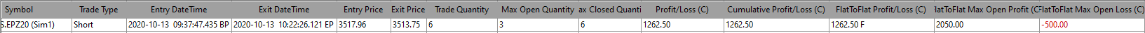 Is it possible to use current Theoretical Average to calculate Max Flat-to-Flat Open Loss? Maybe that's all I need to ask, but in case an example is helpful: --- My executions for today, in order: Sell 1 @ 3520 Sell 1 @ 3516.25 Sell 1 @ 3518 Buy 1 @ 3514.25 Sell 1 @ 3516.25 Buy 1 @ 3513.50 Buy 1 @ 3517.25 Sell 1 @ 3520.25 Sell 1 @ 3517 Buy 1 @ 3513.25 Buy 1 @ 3509.50 Buy 1 @ 3514.75 Here's what they look like on the chart: http://www.sierrachart.com/image.php?Image=1602636812333.png And here's how I think of my Max Flat-To-Flat Open Loss, using LIFO calculations as I do in the SC trade activity log: Open short position (a) @ 20 Add (b) @ 16.25 Add (c) @ 18 AVERAGE: 18.083 / Position:3 / High Price: 20 / MAE = 50 * 3 * [18.083 - 20] = ($287.50) Close the (c) @14.25, booking 3.75 = $187.50 AVERAGE: 18.125 / Position: 2 / High Price: 19.50 / MAE: 50 * 2 * [18.125 - 19.50] + $187.50 (booked profit) = $50 Add (d) @ 16.25 and close it @13.50 to book: 2.75 [$137.50]. Total booked = $325 Close the (b) @17.25, booking -1 = [$50] / Total booked = $275 Holding (a) from 20. High price before next execution: 21.50 / MAE = 50 * 1 * [20 - 21.50] + $275 (booked profit)= $200 Add (e) @ 20.25 / Position: 2 / High Price: 21.50 / MAE = 50 * 2 * [20 - 21.50] + $275 = $125 Add (f) @ 17 and close it @13.25 to book: 3.75 [$187.50] / Total booked = $462.50 The rest is irrelevant to the MAE. My maximum heat was being down $287.50 after the add at (c). From there I never took heat again. But here's the rest: Close the (e) @ 9.50 to book: 10.75 [$537.50] / Total booked = $1000 Close the (a) @ 14.75 to book: 5.25 [$262.50] / Total booked = $1262.50 Is it possible to calculate Max Open Loss this way within Sierra Chart? In the Trade Activity Log the Max Flat-to-Flat Open Loss is $500. I attached a screenshot: 02_101320 max f2f open loss. Thanks. |