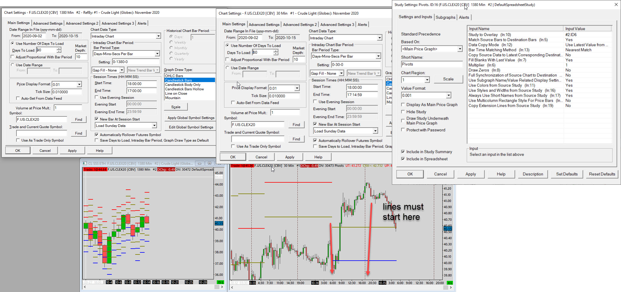 i have a 1380min chart for full session with spreadsheet study to calculate specif levels for current session I use study overlay to another chart to draw these calculated lines from spreadsheet, but these lines start not at the beginning of the session, but start and end weird places I can not figure out why, see screenshot |