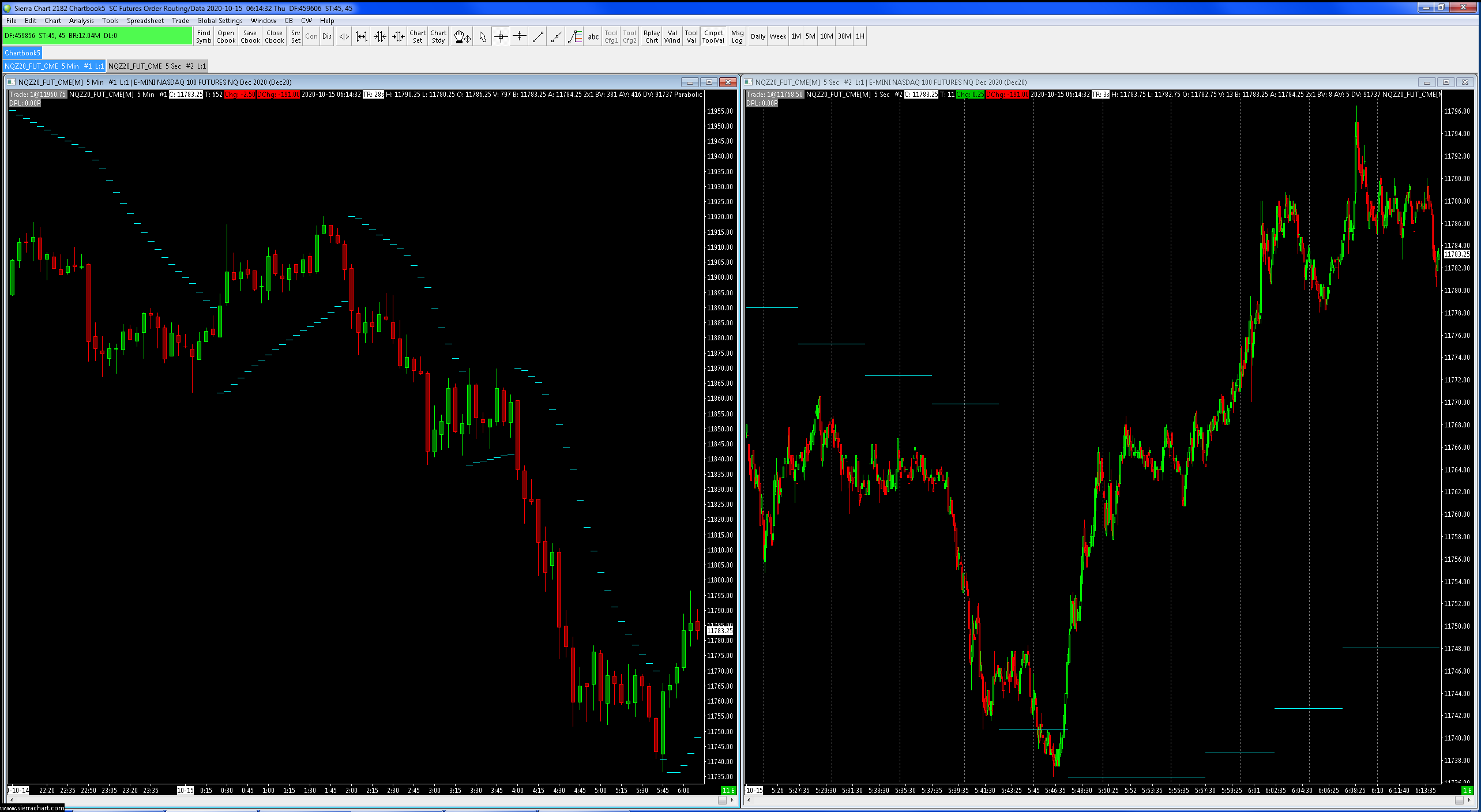 Thanks for the link, that's been annoying me for a while.  But the overlay isn't the issue; I just included that to highlight what was going on inside the 5 minute bars. Replaying the chart shows: - at 05:45:00 the Parabolic value for the 5:45 bar opens at 11766.00 - at 05:46:29 the bar hits the trend and bar low of 11736.75 - at 05:49:44 the bar hits the bar high of 11766.00, touching the Parabolic value The issue is that when SC flips the marker from above to below at 05:49:44, it uses the trend low set in the previous bar (11740.75) instead of the actual trend low of 11736.75.  |