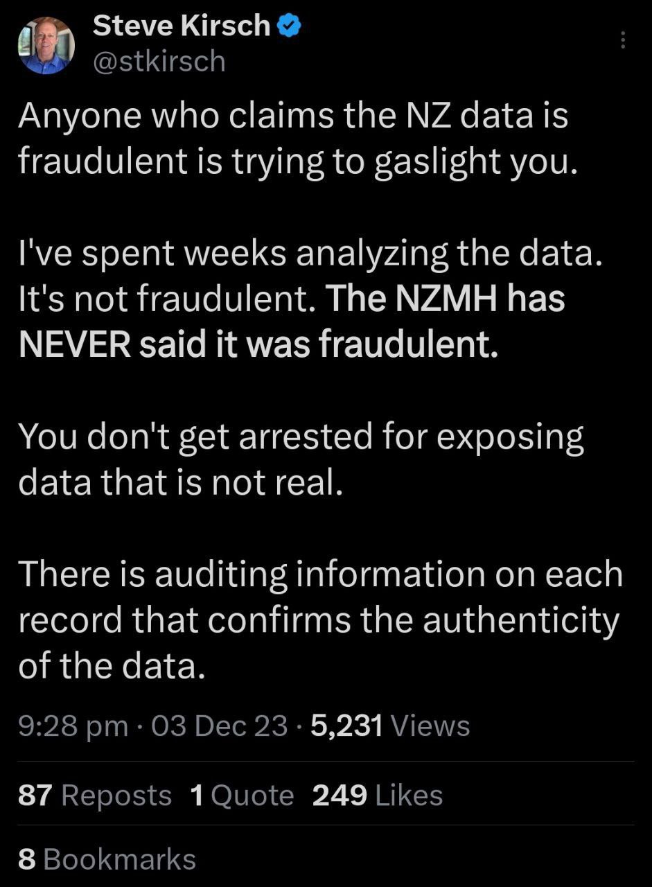 Liz Gunn, has put out a video of the whistleblower having been raided by the New Zealand police, clearly related to releasing the anonymized Ministry of Health data exposing excess deaths from the covid bioweapon shots, which demonstrates clear wrongdoing on the part of all those involved in decision-making related to the purchasing and forcing these shots on the New Zealand people. The New Zealand government has been repeatedly warned, about the danger of these shots, but yet they have repeatedly ignored these warnings, and deliberately censored people and imprisoned people related to this. This is very serious crimes against humanity. Please stop these raids, and insist on an immediate release of this person and any related persons who have also been affected by these New Zealand police raids. This person is someone who is acting in the interest of the New Zealand people and the world. He is not a criminal. Message sent to New Zealand lawyers in 2021 August at the early preliminary start of the shots being given to the New Zealand people: Do you know, that the NZ government is paying 200 NZD per injection to Pfizer to murder and disable the New Zealand people. [removed] And then they keep these agreements private and agree to even defend Pfizer against the murder and infliction of suffering upon the NZ people, that there injections are actively doing at this time. This is nothing more than God damn insanity. It's pure God damn evil.