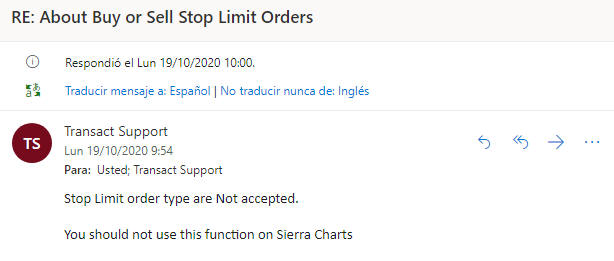 Yes this order type is supported with Transact. We need to see the error message you are getting. For instructions to provide this, refer to: Support Board Posting Information: Providing Lines From Trade Service Log Sierra Chart Support - Engineering Level Your definitive source for support. Other responses are from users. Try to keep your questions brief and to the point. Be aware of support policy: https://www.sierrachart.com/index.php?l=PostingInformation.php#GeneralInformation For the most reliable, advanced, and zero cost futures order routing, *change* to the Teton service: Sierra Chart Teton Futures Order Routing Date Time Of Last Edit: 2020-10-19 13:59:01