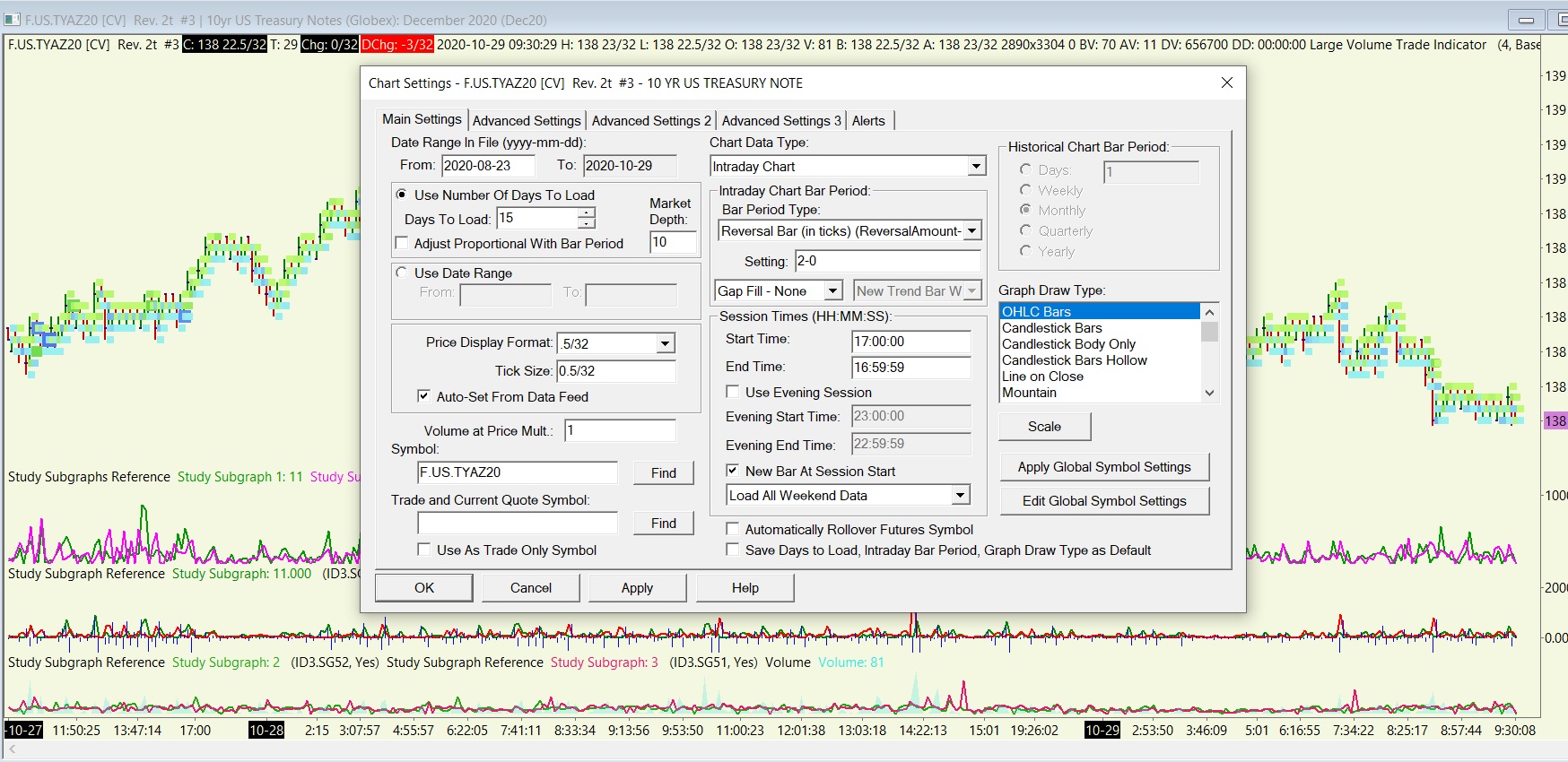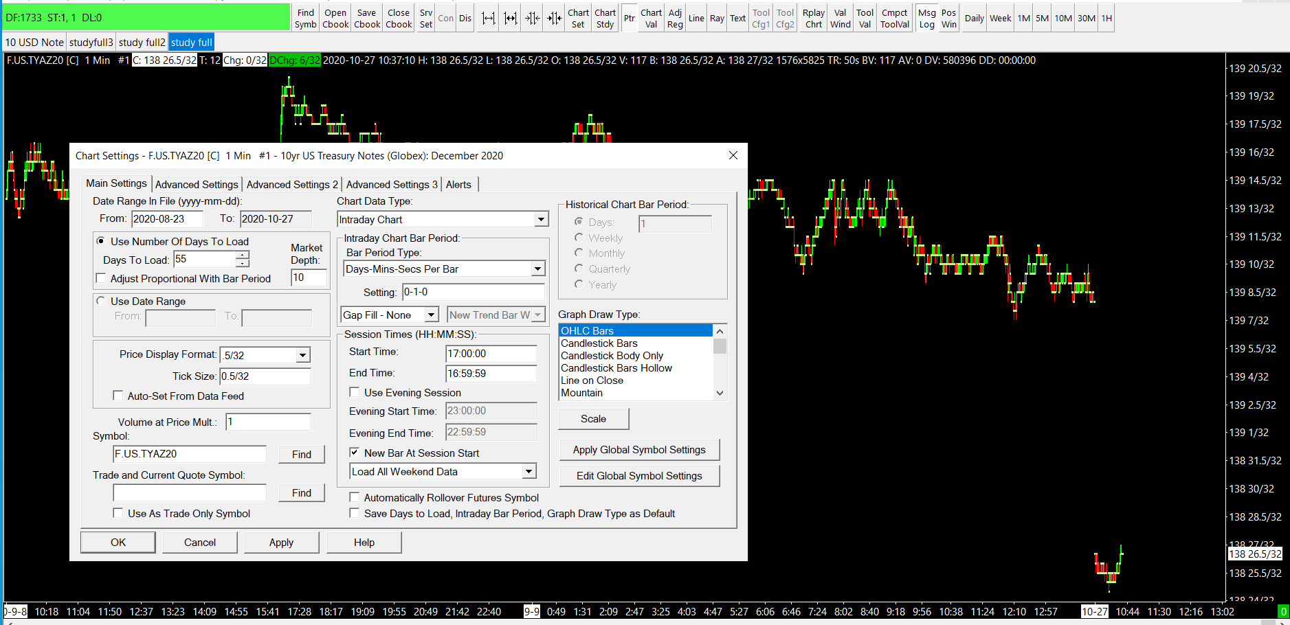 To begin with, your settings only have 15 days being loaded. Since today is October 29, 2020, your chart should only go back to October 14, 2020. If you scroll the chart all the way to the left, then what is the date of the first bar? For the most reliable, advanced, and zero cost futures order routing, use the Teton service: Sierra Chart Teton Futures Order Routing |