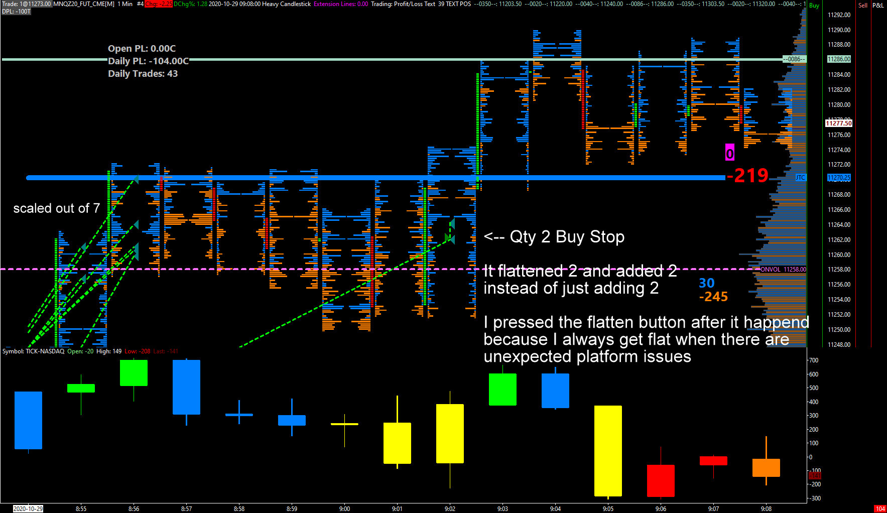 Team, On 2 occasions now I have witnessed the following: I was long 9 contracts with an oco bracket. I clicked the x to cancel the targets while leaving the stops in place. I had scaled out of 7 contracts and was holding 2 with the stops moved to break-even. I placed a buy-stop of 2 contracts above the current price. When price touched the buy-stops, the remaining 2 contracts were sold with the same audio alert as when targets get filled. 2 new contracts were added. There were no active targets resting in the TradeDOM. The desired outcome: Add 2 contracts for a total of 4 long. The actual outcome: The 2 contracts I was holding were sold. 2 new contracts were added. I immediately pressed the FLAT button to get out. Thanks. Date Time Of Last Edit: 2020-10-30 01:18:00