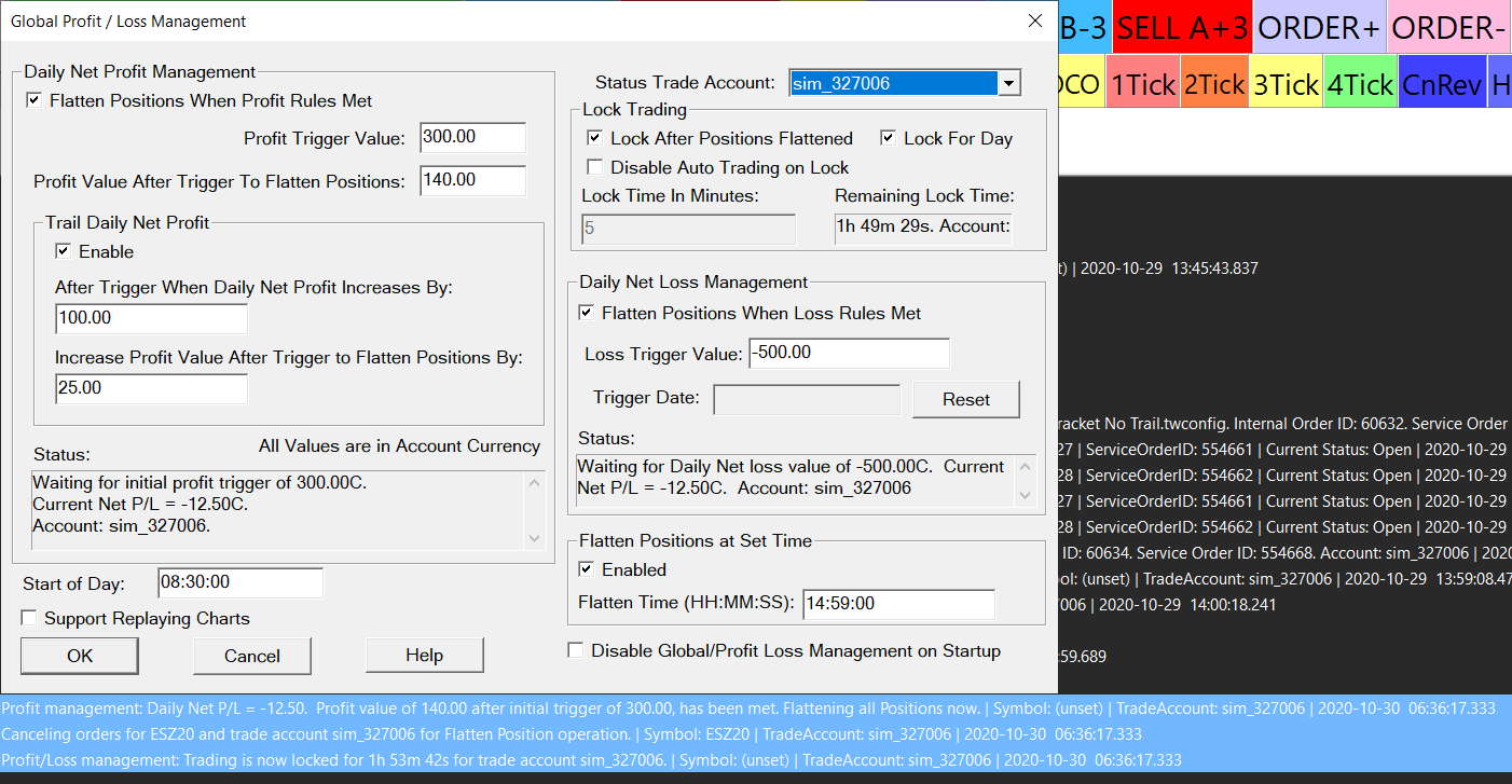 I was just starting my day and so was going to play around a bit in sim to get my brain going. I entered a trade in ES and it was immediately closed. Checking the log, it says the Global P&L management had kicked in, but it definitely shouldn't have. Here's the log: Profit management: Daily Net P/L = -12.50. Profit value of 140.00 after initial trigger of 300.00, has been met. Flattening all Positions now. | Symbol: (unset) | TradeAccount: sim_327006 | 2020-10-30 06:36:17.333 Canceling orders for ESZ20 and trade account sim_327006 for Flatten Position operation. | Symbol: ESZ20 | TradeAccount: sim_327006 | 2020-10-30 06:36:17.333 Profit/Loss management: Trading is now locked for 1h 53m 42s for trade account sim_327006. | Symbol: (unset) | TradeAccount: sim_327006 | 2020-10-30 06:36:17.333 And attached is a screenshot of my settings. So it's clearly not hit the P&L limits... what happened? I can't enter anything now since it's locked and will have to unlock/reset it. |