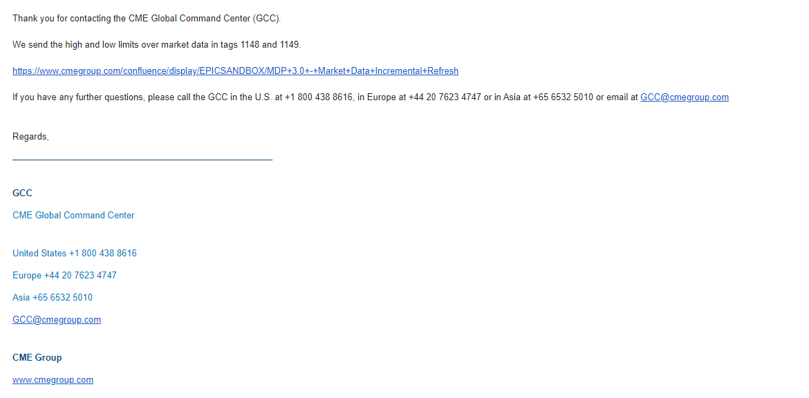 The CME has just got back to me on my email. Here is the link they provided https://www.cmegroup.com/confluence/display/EPICSANDBOX/MDP+3.0+-+Market+Data+Incremental+Refresh I think you can pull the CME price limits off their API. Maybe Sierra Chart can provide us access? |