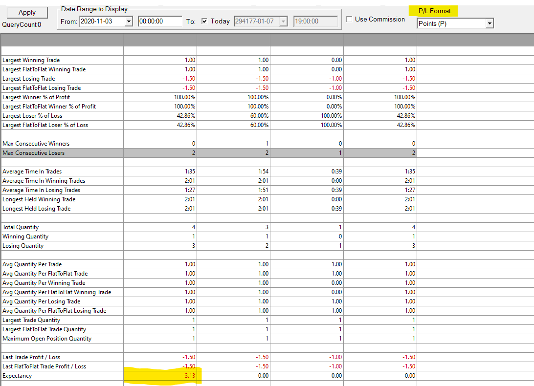 Hi, I don't know if this is by design but the expectancy value is only correct when you use currency value as p/l format. When you switch p/l format to points or ticks etc. it won't change to the correct format (see attachment). Best regards, Maurice |