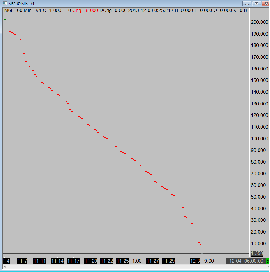 SCID files have the following fields available. Date, Time, Open, High, Low, Last, Volume, Number of Trades, Bid Volume, Ask Volume. If you want to see the data visually then you will need to replace the OHLCVTBA data with your data. Disconnect from your data feed and Edit>>Export Intraday Data to Text File. Open the txt file with excel, modify the data as desired, then resave as a csv file with a different name. Then you can import the data using Edit>>Import and Load Intraday Data. I did this quickly using an M6E-201403-CME data file that I resaved as M6E, but after I imported I could not see anything, so I added a Moving Average-Simple using LAST as the input data with a period of 1 and then I could see the data. I used LAST because that was the data I replaced, and I deleted everything else. See attached pic. I am sure that a competent programmer could quickly create a custom study to automatically do this for you. Unfortunately I am far less than a competent programmer and this is beyond my skills. You may need to pay someone. To export to csv file, copy and paste the data from spreadsheet to excel and save as csv file. Again, a custom study could do this automatically as well. Date Time Of Last Edit: 2014-03-07 22:36:43