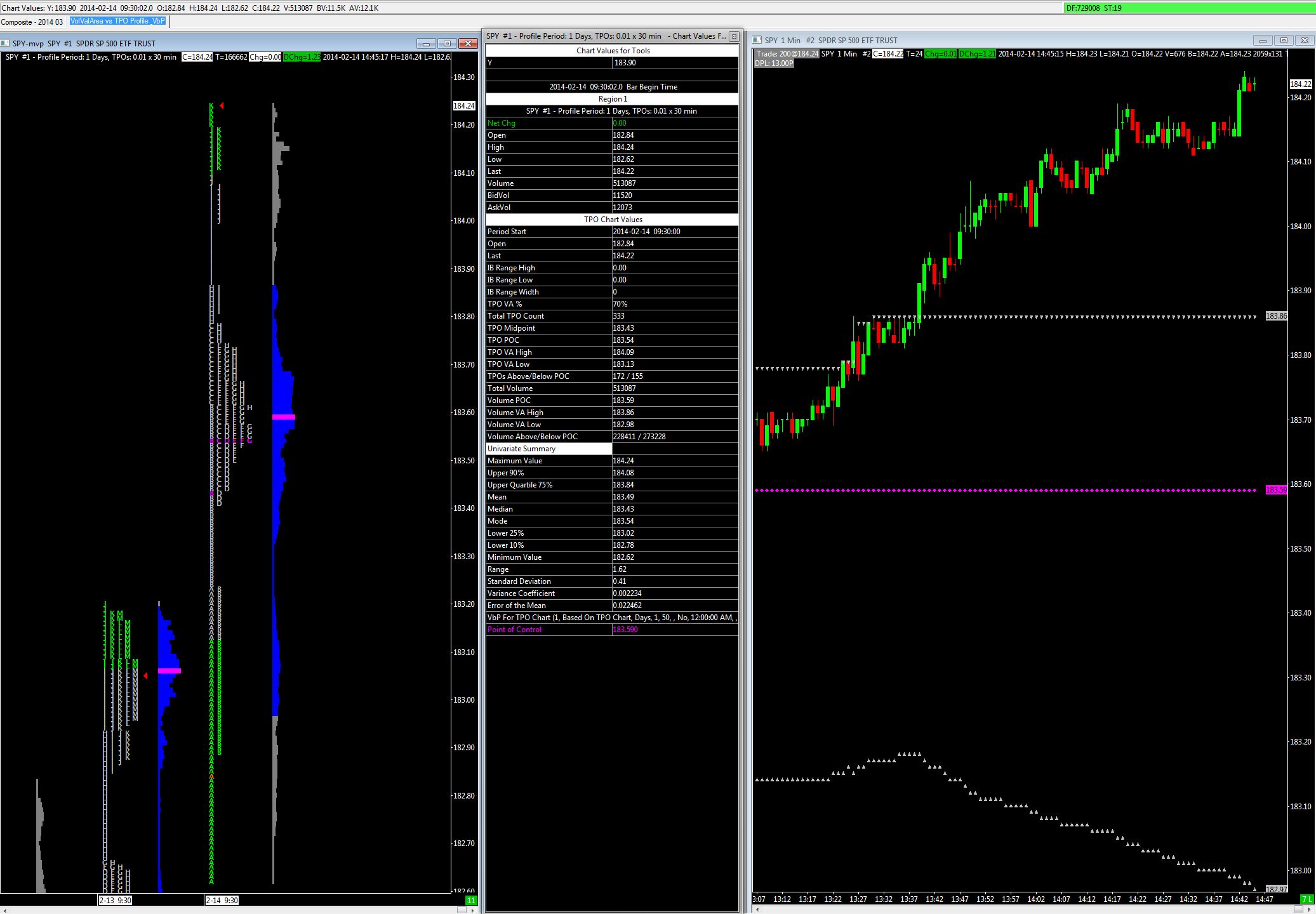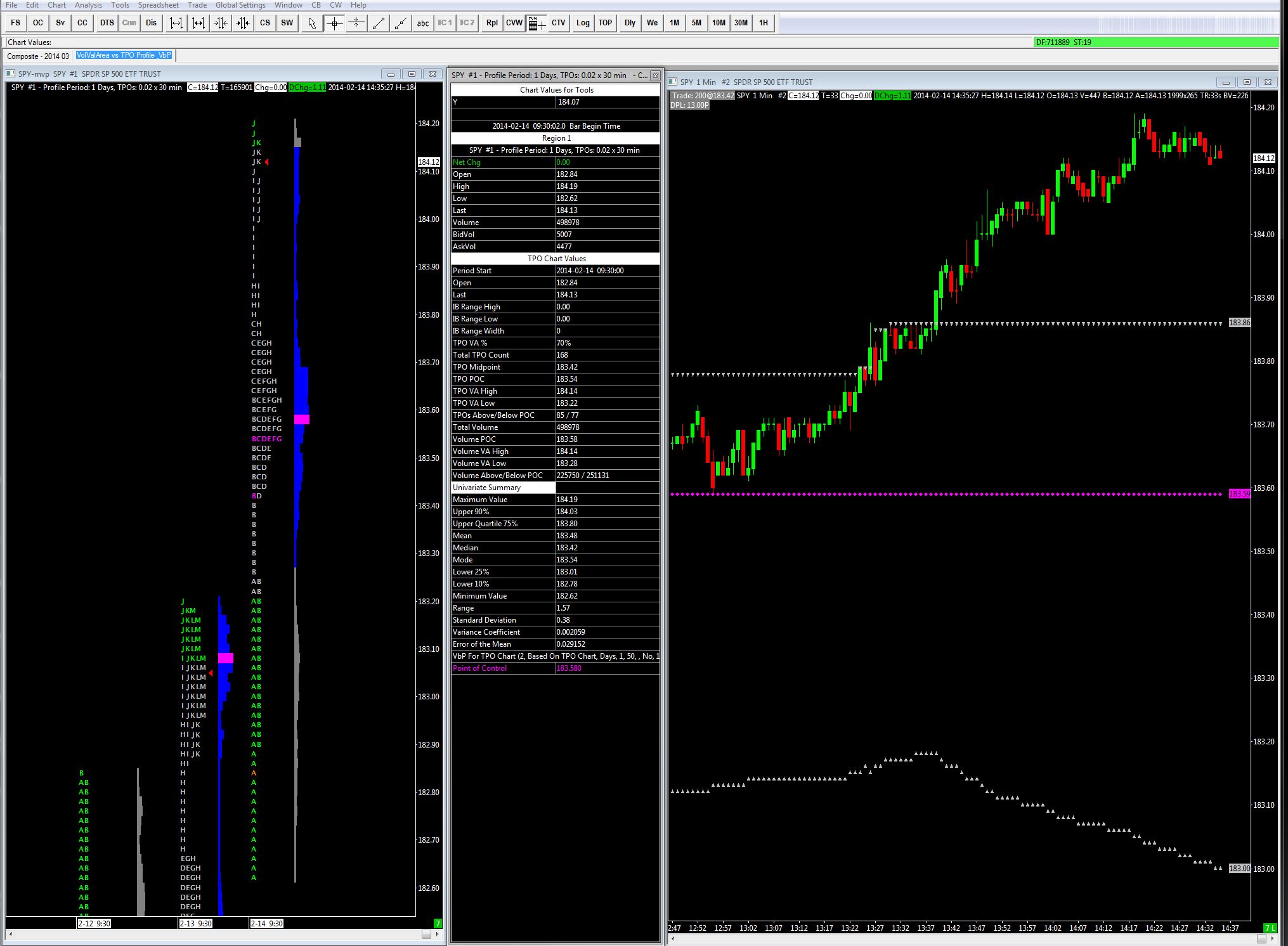 SC Support, Many thanks in advance for your help. I noticed this issue some time ago, and have tried to resolve myself to no avail. Enclosed please find 3 screenshots in addition to the requested Chartbook. I include additional attachments because I believe that the Letter/Block Price Increment in Ticks may be relevant. 1) Simplified Chartbook as requested. 2) Screenshot #1 with Letter/Block Price Increment in Ticks set to my default of 2. 3) Screenshot #2 with Letter/Block Price Increment in Ticks set to 1. 4) Screenshot #3 with Letter/Block Price Increment in Ticks set back to my default of 2. Just in case the screenshots are difficult to read, the values for VAH, PoC, VAL for the TPO & VbP chart. #1 184.14 183.58 183.28 #2 183.86 183.59 182.98 #3 184.16 183.58 183.28 The corresponding values for 1 min chart are basically the same in all 3 screenshots: #1 183.86 183.59 183.00 #2 183.86 183.59 182.97 #3 183.86 183.59 182.96 Although there is a small variation in the VAL, it is probably because the market traded consistently higher during the short period when I ran these tests. My concern is the shift in the VAH & VAL of about 30c when changing the Letter/Block Price Increment. When this is set to 1 tick, the TPO/VbP chart is consistent with the Value Area Lines on the 1 min chart. Given the Letter/Block Size Increment setting does NOT exist on the Value Area Lines study, can I assume that it is set internally to the natural minimum of 1 tick? Although changing the setting to 1 tick seems to make things consistent, it is not clear to me why changing from 1 tick to 2 ticks should have should a large impact on VbP? I can see how it might affect the TPO PoC & Value Areas because increasing the size makes the calculations less precise as one TPO can shift things widely given the limited amount of TPO’s on a typical trading day. However, the volume traded at 1 tick vs. 2 tick increments should be less vulnerable to such distortions. This is especially true for SPY (SP500 ETF) given (1) highly liquid with typical volume of 100mm+ shares and (2) the very small tick size of only 1 cent vs. the equivalent of a 2.5 cent tick size for the ES future. Both before and during these tests, I used Delete and Download Data to make sure this was not an issue. I also ensured that my Chart Settings were consistent in terms of Tick Size and Session Times. I appreciate your time and attention. Please let me know if you need more information from me. |