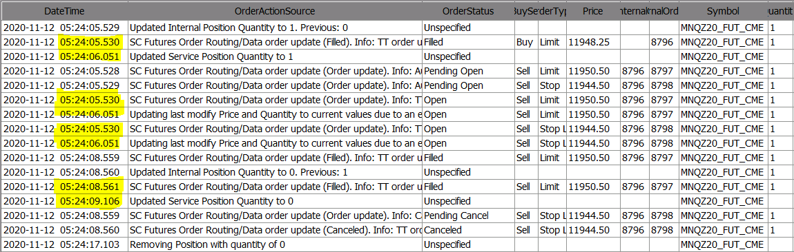 The trade activity log and the order fills plotted on the chart are really messy because the routing server's clock (SC Future Order Routing) is ahead by 500 ms. It is really annoying for rapid scalping when examining the past trades shifted by 500ms. Please adjust this server clock. Attached : Trade Activity Log with 4 couples of timestamps (SC server / SC client). Note : my timestamps are precise by about 20ms (I trade with a VPS located in Chicago, and I use a software that adjusts the clock every hour). |