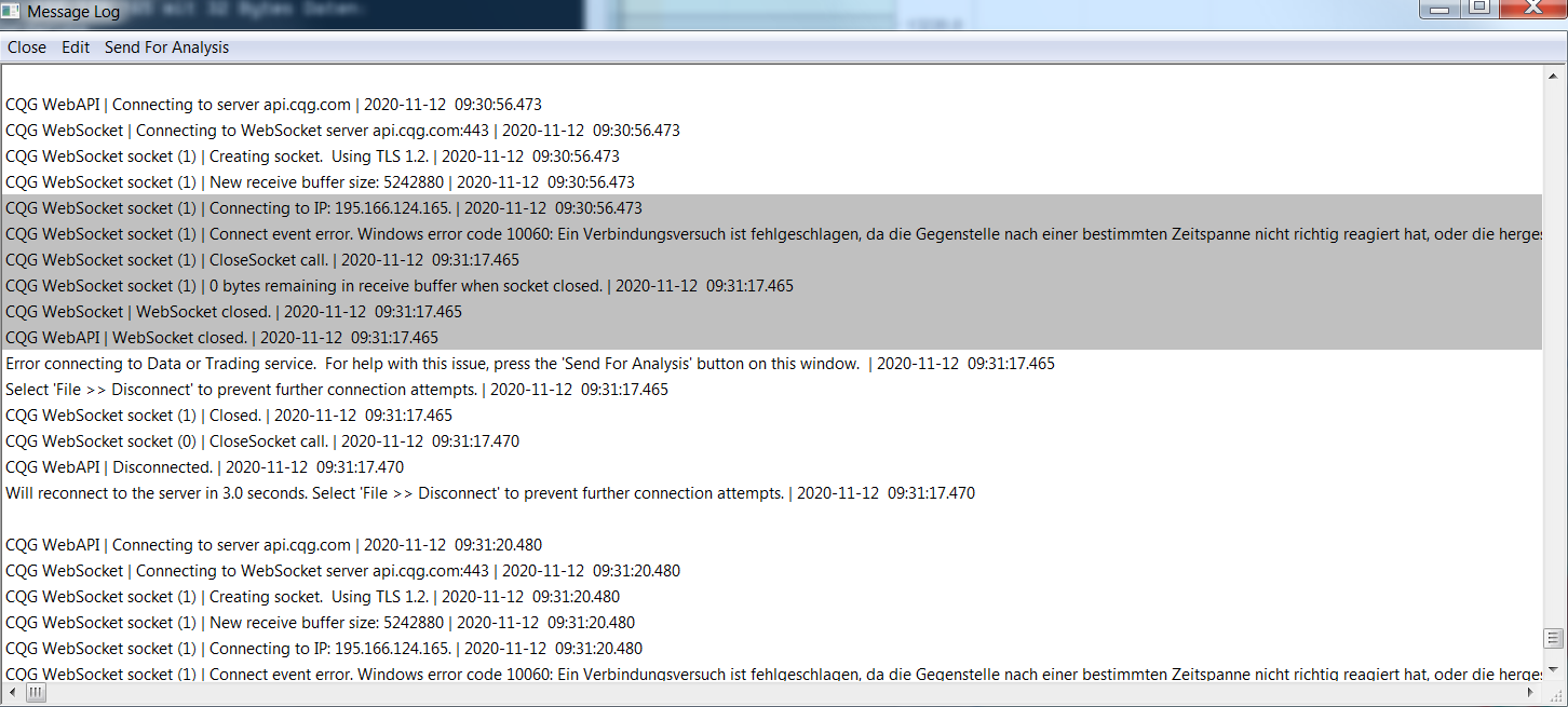 Sierra Chart (Version 2192 64-bit (34321)) Since Wednesday I could not connect to CQG WebAPI. AMP tried already to support since yesterday, but with no solution. I have also checked the Data/Trading Service Connection and Symbol Issues. Unable to Connect to Data or Trade Server. 1.2. Network Communication or Server Problem -> (Service Name/Socket Name) | Windows error code 10060: A connection attempt failed because the connected party did not properly respond after a period of time or established connection failed because connected host has failed to respond. So I did restart in Safe Mode with Network support to exclude issues with the firewall, but this did not solve the issue. I would appreciate to have input from Sierra Chart to this issue as soon as possible. Please refer to the attachment log file ! Best regards |