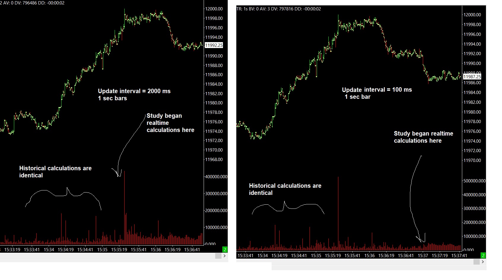 I actually am finding this to not be true in one case... I have a study which is based off your study that sums charts. It sums the volume of whatever charts are open, more than 10 charts The historical calculation is identical- it does not depend on what the chart update interval is. However, once the real time calculations begin, I get different results depending on chart update interval. I am sure to clear the subgraph data to zero before each loop through the charts (to gather the volume data up). This still does not give a consistency. See attached. |