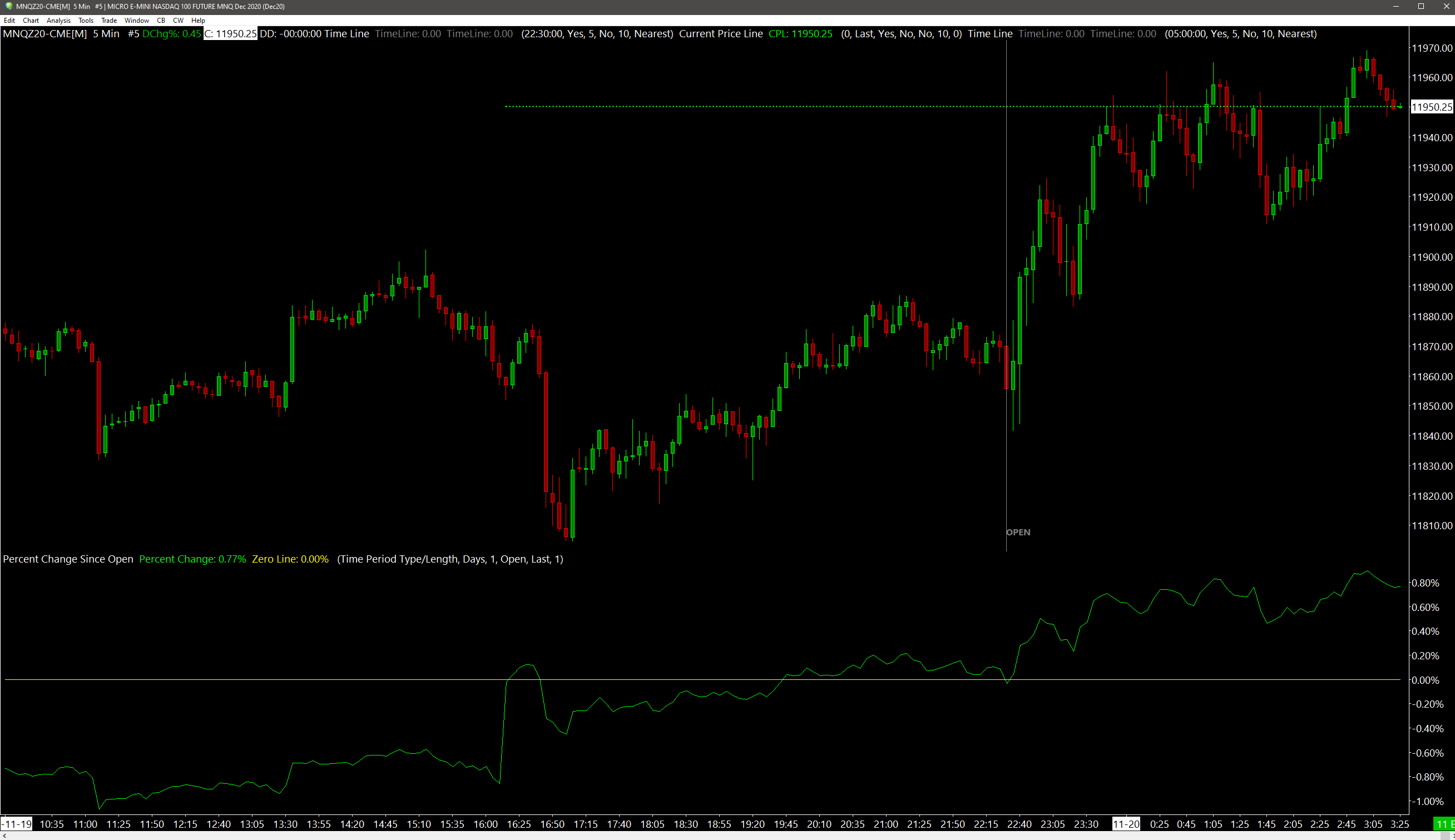 1. You have your Percent Change since Open set to compare the Last price against the Open and to have it reset at the beginning of each day. Since you are comparing the Last to the Open, the Percent Change at the beginning of the day will not be zero, but will be the (Last - Open) / Open for that first bar of the day. Refer to the information on the calculation of this study here: Percent Change Since Open Also, you cannot compare that number against the Daily % Change. The Daily change is computed based on the previous day's Settlement price, which is not the same as the Last price of the day. Refer to the information on Daily Change in this section: Working With Charts: Chart Header Field Descriptions 2. The Time Line that you are showing has a time entered as 22:30. That value is entered into the study for where the line shows up. It is not automatic. Refer to the information for the Time Line study here: Time Line For the most reliable, advanced, and zero cost futures order routing, use the Teton service: Sierra Chart Teton Futures Order Routing |