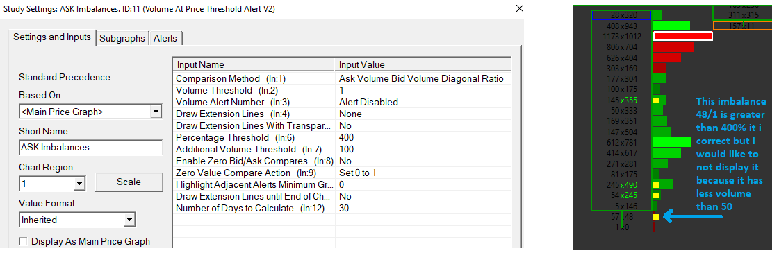 Hi, I am using Volume At Price Threshold Alert V2 to configure a Dot with every price level that is above 400% imbalance as it is explained in documentation Volume at Price Threshold Alert V2 I'm using "Ask Volume Bid Volume Diagonal Ratio" as comparison method with a Percentage Threshold of 400%. But I would like to display only imbalances that ask more than an amount of volume not just the 400% difference I attach an example |
