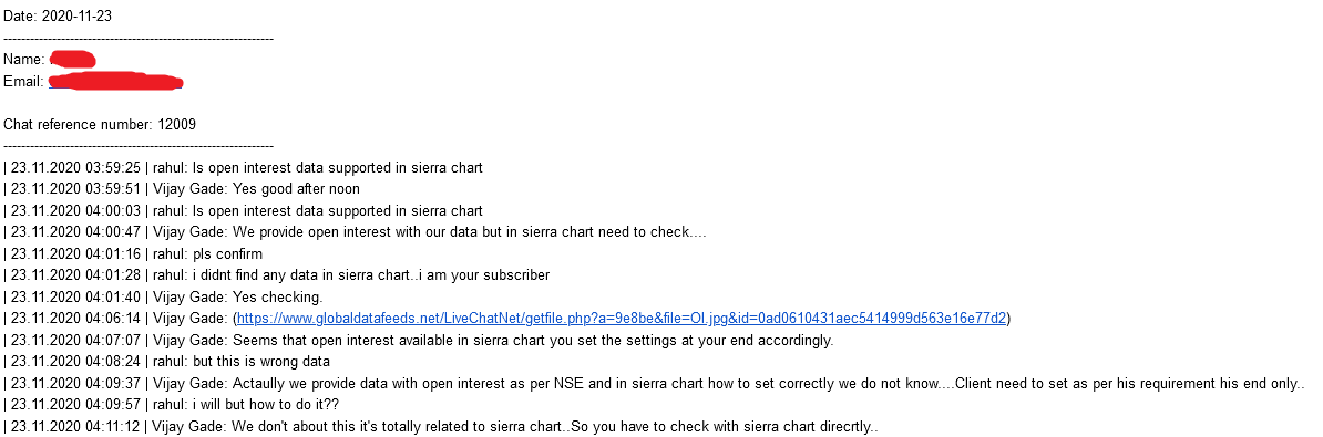 Hi I am a global data feed client. They say they offer open interest data. But when I plot it in sierra it shows the wrong data. They have asked to contact you to help in setting it. I have attached their chat transcript and the image where it shows the wrong data. Please help. |