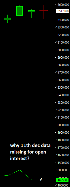 In this post wrong open interest data (globaldata feed - india) | Post: 242688 you said: "There is definitely no support for futures contract Open Interest data for Intraday charts. It is only supported with Historical Daily charts." Does that mean even if GDFL has real-time intraday open interest data (which they have), you will not be able to plot it using the 'Open Interest' study, as this is the drawback at SC's end and only historical open interest can be plotted? or You didn't get support from GDFL for intraday open interest data in getting it interfaced using DTC protocol. Also, I have attached a screenshot where on the daily chart 11th Dec open interest data is missing! Why? |
