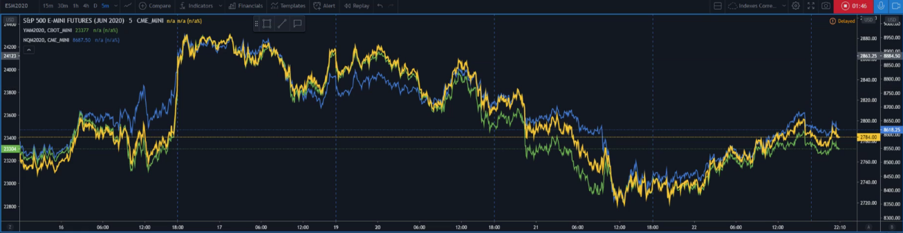 Is there any way to overlay instruments on the chart with independent price scales for each instrument? As show in this screenshot. Here you see a chart with lines for ES, NQ and YM but each has their own independent price scale, which is exactly what i need. I tried the add instrument study but i can't manage to get independent price scales. |