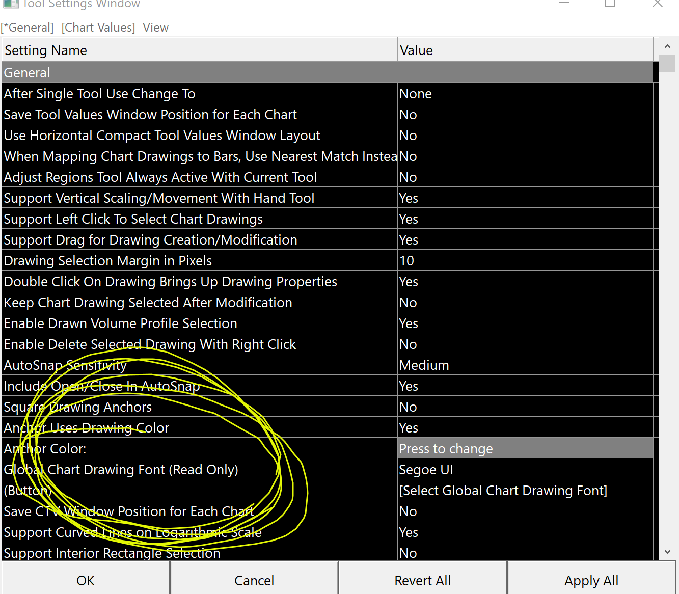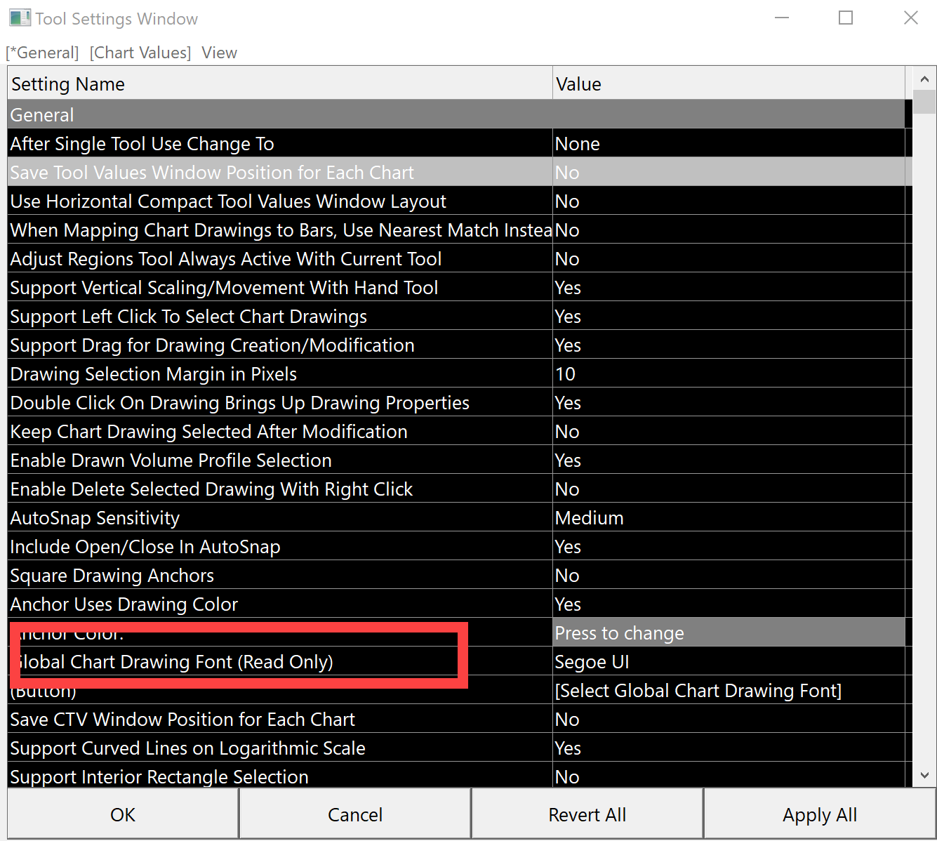 Click on where it states [Select Global Chart Drawing Font]. This will bring up the window to select the font. You may need to click it twice, once to activate that section and the second to actually select the button.