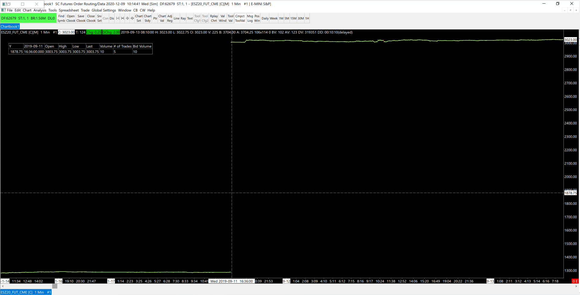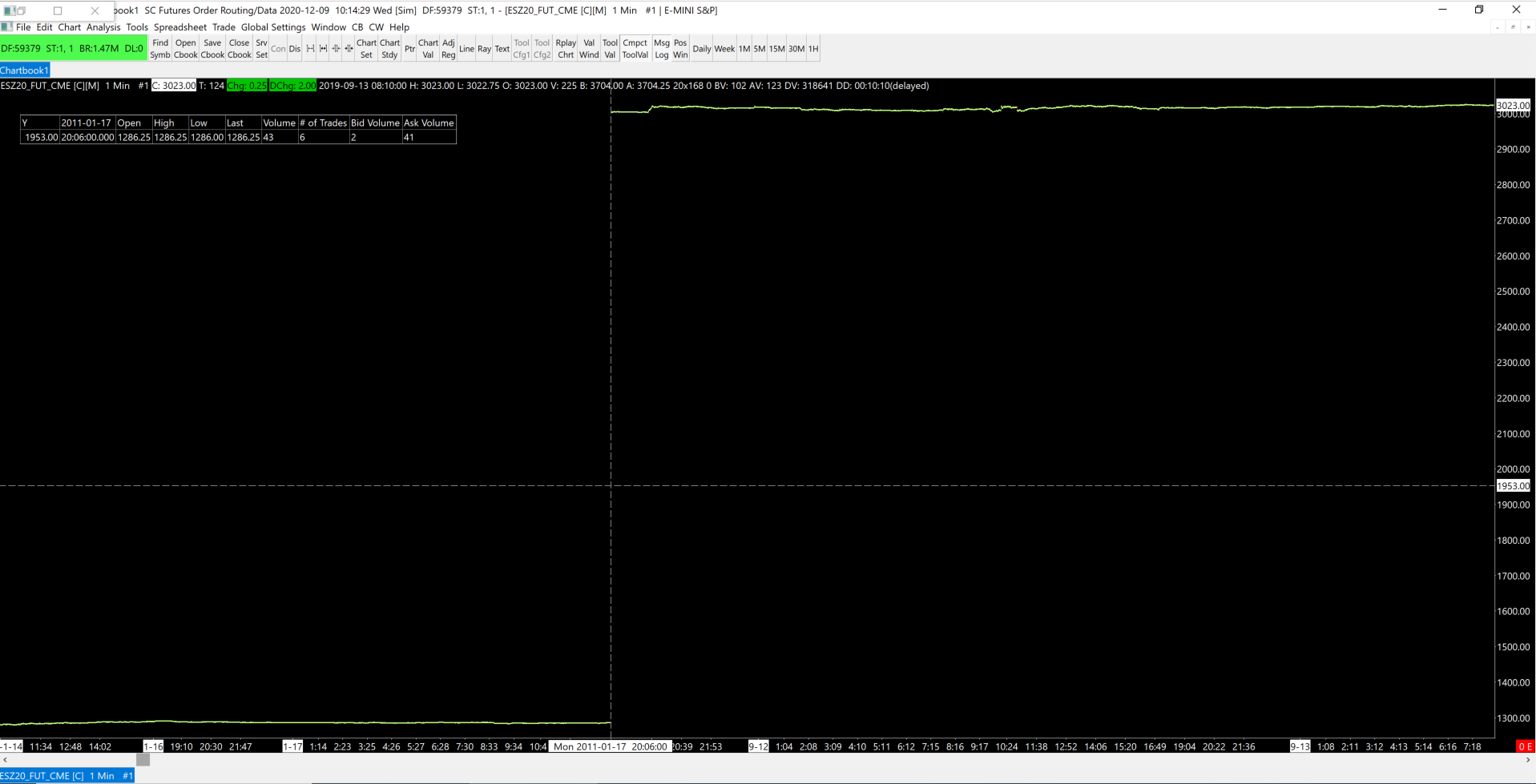 Hello, I am trying to load intraday 1-min OHLCV data for the continuous contract for the ES-mini. I currently have Service Package 5 and I am not subscribed to any live data feed. My settings are as follows: Data/Trade Service Settings: Service: SC Futures Order Routing/Data [trading] Intraday Data Storage Time Unit: 1 Minute Max Historical Intraday Days to Download: Non-Tick Data: 3650 1-Tick Data: 3650 Chart >> Chart Settings >> Main Settings Use Number of Days to Download: 3650 Chart >> Chart Settings >> Advanced Settings Continuous Contract: Continuous Futures Contract - Date Rule Rollover As stated in the title, when I load up the data, all data from 2011-03-02 to 2019-09-11 is missing. Attached are detailed screenshots that show my settings as well as demonstrate the chart with missing data. I have also already tried performing the steps given here: Historical Intraday Data (Missing Data / Download Errors / Viewing More Data): Retrying the Download When There is Data in the Chart but it didn't help. Date Time Of Last Edit: 2020-12-09 19:36:42