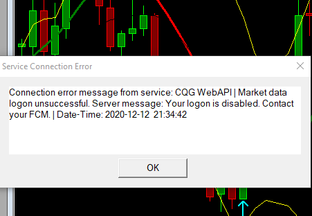 Yes, that is a CQG error. We cannot help with that and it should no longer be relevant. We see your account is set to use the Sierra Chart Order Routing Service and you have the Denali Exchange Data Feed activated. Therefore, you need to start with step 9 here: https://www.sierrachart.com/index.php?page=doc/SierraChartOrderRoutingServiceWithData.php#SetupInstructions You will not be using CQG any longer. Sierra Chart Support - Engineering Level Your definitive source for support. Other responses are from users. Try to keep your questions brief and to the point. Be aware of support policy: https://www.sierrachart.com/index.php?l=PostingInformation.php#GeneralInformation For the most reliable, advanced, and zero cost futures order routing, *change* to the Teton service: Sierra Chart Teton Futures Order Routing |