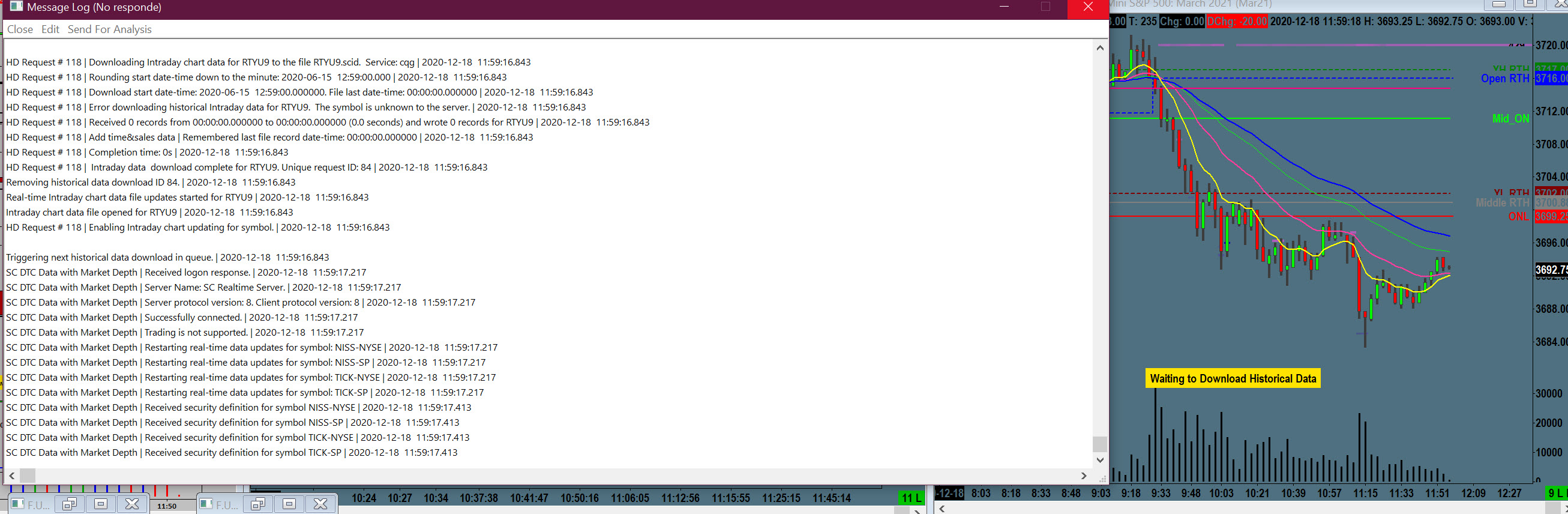 The images are not showing us any issues. If you are downloading a new symbol, then it can take some time for that process to complete. Also, we see in your log that you have a few charts with incorrect symbols: YMU9; NQU9; ZBU9; RTYU9. Select Edit >> Translate Symbols to Current Service to update those symbols for the correct CQG symbols. Also, we need to understand what you mean by frozen. Is that just that you are not getting data (which may be related to the symbols being used) or can you not interact at all with the Sierra Chart interface. For the most reliable, advanced, and zero cost futures order routing, use the Teton service: Sierra Chart Teton Futures Order Routing |