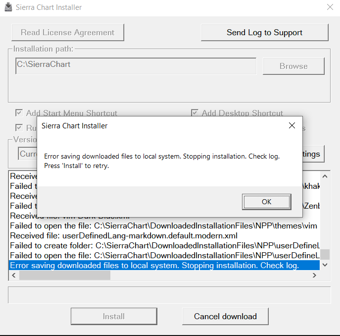 First, the software installer failed as it looks like you do not have permission to write to the directory to which you were trying to install Sierra Chart. Make sure that when you run the installer that you have the proper permissions for the C:\SierraChart directory for the account from which you are performing the installation. You can try to run the Installer again and have it install the SierraChartStudies_64.dll file. Since you have created the files, it may run properly. You can also go into the zip installer and copy and paste the file into your main Sierra Chart installation folder (C:\SierraChart). If your anti-virus scanner is removing the file, then you will need to put in an exclusion for that file. For the most reliable, advanced, and zero cost futures order routing, use the Teton service: Sierra Chart Teton Futures Order Routing |