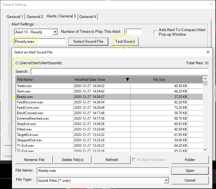 The file name that you have highlighted in that screenshot, what is the exact folder path that it is located within? It should be C:\SierraChart\AlertSounds Sierra Chart Support - Engineering Level Your definitive source for support. Other responses are from users. Try to keep your questions brief and to the point. Be aware of support policy: https://www.sierrachart.com/index.php?l=PostingInformation.php#GeneralInformation For the most reliable, advanced, and zero cost futures order routing, *change* to the Teton service: Sierra Chart Teton Futures Order Routing Date Time Of Last Edit: 2020-12-27 22:27:36