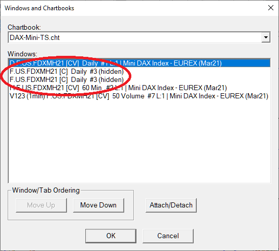 Dear support, my study needs information of a daily-chart, so I'm opening it with sc.OpenChartOrGetChartReference(). I'm doing this in the setDefaults-section of the study because doing this later on causes a re-calculation of the study without a need for it. So far everything works fine and the calculations are done properly. After the loading of the study (which is used by two charts in the same chartbook), the windows and chartbook window show the expected content (please see WindowsAndChartbooks1.png, which is perfectly fine!). When I'm saving, closing and re-opening the chartbook the hidden referenced chart is shown there two times but with the same ID!? (please see WindowsAndChartbooks2.png). The issue is: everytime I save the chartbook (for whatever reason), another hidden chart is added with the next opening of the chartbook, causing LOTS of hidden charts but all with the same ID!? When closing the charts manually, there is a warning message for all windows saying they are referenced by chart #7 (what is true but why are ALL referenced and not only one!?). How can I prevent unused charts being created or make SierraChart use the already existing chart after a reload of the chartbook? As the settings for the hidden chart do not change, why isn't the "saved" hidden chart (in this example with ID #3) referenced? Thanks a lot in advance for your help! Regards, Markus |