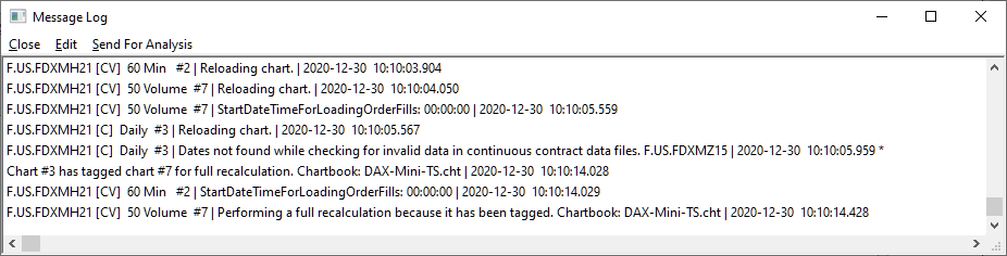 If this is true, there would be a message in the Message Log indicating that a chart has been tagged for recalculation. if a futures contract is rolled over, a new daily chart is created by the function based on the latest future This is because you are causing this circumstance to occur. How you are doing that is unknown to us. This is for you to solve. It certainly does not happen on its own if you are specifying the same PriorChartNumber when calling the function.