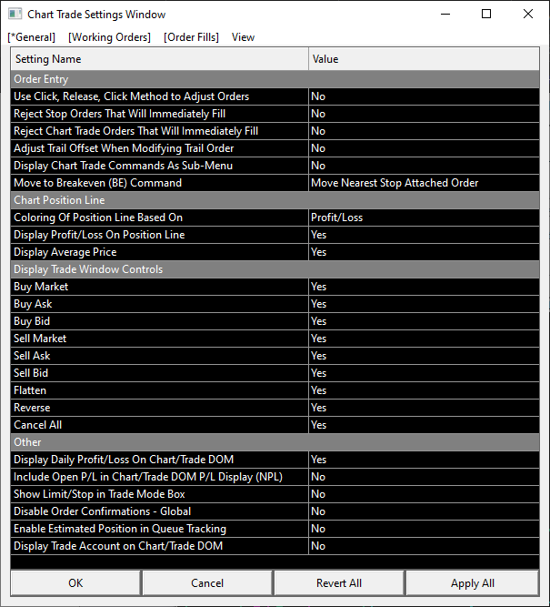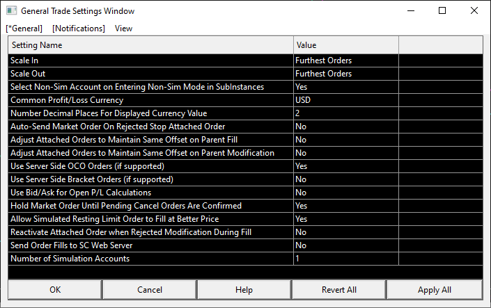 1. Yes, you need to change the Width for these Graphics Settings: Bar High-Low Down Bar High-Low Up Refer to the information starting here: Graphics Settings: Bar High-Low Down 2. We are not sure which option you are looking for and what you want in terms of options. But, refer to the following: Global Trade Settings Windows: Coloring Of Position Line Based On (Global Settings >> Chart Trade Settings >> General >> Chart Position Line) 3. The options in Global Settings >> General Trade Settings >> Scale In/Scale Out set how the Scale In and Scale Out are going to function. The control for whether you Scale In or Scale Out is on the Trade Window for each chart. Refer to the information here: Basic Trading and the Trade Window: Main/C >> Menu >> Orders >> Support Scale In (chart specific) For the most reliable, advanced, and zero cost futures order routing, use the Teton service: Sierra Chart Teton Futures Order Routing |