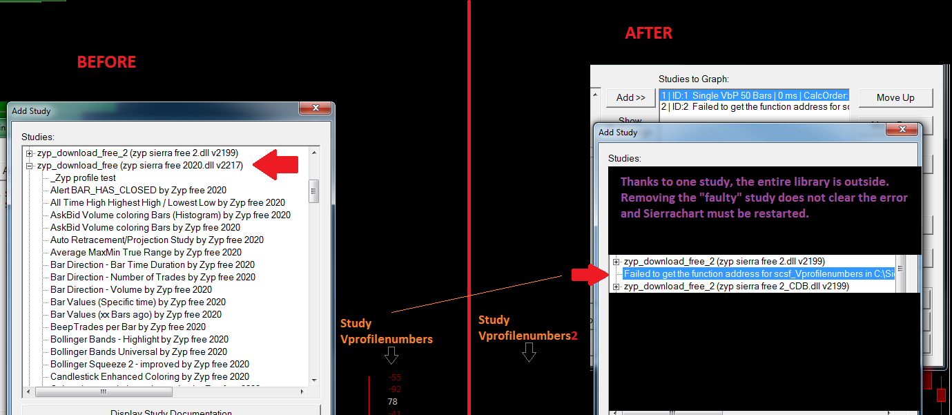 Guys.....I like your program. After all, we all just try to make everything work without any surprises. Nothing more....Take a look at the attachment ... In earlier versions of Sierrachart, if a study in the library was deleted but someone already used it in the chart it appeared at the end of the list of all studies as non-existent .... Now the whole library has gone .... It doesn't limit me when I know it, I wrote it above for others (or for you if you're interested about it) Compiled for ver 2217 but tested 2217,2220,2222,2225 Date Time Of Last Edit: 2021-01-31 13:05:55