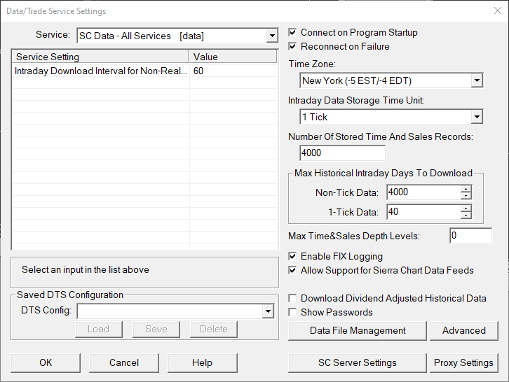 I am having difficulty in downloading anymore than the past 25-30 days of minute data from the Sierra Chart Historical Data Service. I have included images of my data/trade service settings along with the chart settings for reference. I have tried deleting all the data and re-downloading it. Is this available or do I have to sign up for the real time service to get the historical data for the TSE/TSX? |