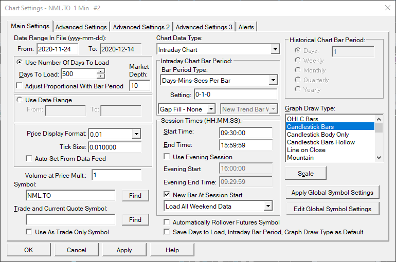 For the NML.TO symbol there is not data available beyond 2020-12-14. Apparently trading has stopped for that symbol at that time. You do have full access to the historical data. Follow the instructions here to access more data: Historical Intraday Data (Missing Data / Download Errors / Viewing More Data): Downloading/Viewing More Historical Intraday Data And understand that the Maximum Historical Intraday Days to Download in the case of stocks counts back from the current date. So you will need to increase this as necessary for symbols which are no longer trading. Sierra Chart Support - Engineering Level Your definitive source for support. Other responses are from users. Try to keep your questions brief and to the point. Be aware of support policy: https://www.sierrachart.com/index.php?l=PostingInformation.php#GeneralInformation For the most reliable, advanced, and zero cost futures order routing, *change* to the Teton service: Sierra Chart Teton Futures Order Routing |