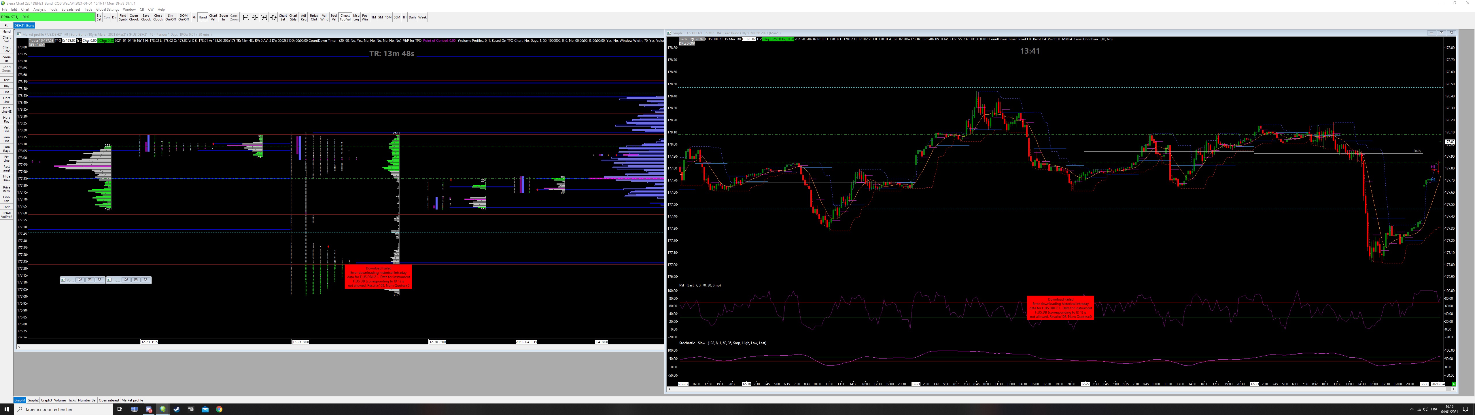 Good afternoon, since a few days I have the following message when opening SC : "Download failed error downloading historical intraday data for F.US.DBH21. Data for instrument F.US.DB(corresponding to ID 1) is not allowed. Result=103. Num Quotes=0" Find attach a screenshot and just below my log report. Many thanks for your help Herve Reading Internal Order ID file. | 2021-01-04 16:46:02.598 Reading Trade Orders file. | 2021-01-04 16:46:02.638 Reading Trade Positions file. | 2021-01-04 16:46:02.638 Reading Account Balance file. | 2021-01-04 16:46:02.639 UDPListener (1404). Port 22904 | Listening on UDP port 22904. | 2021-01-04 16:46:02.647 Software version: 2215 64-bit | 2021-01-04 16:46:02.647 Primary Thread ID: 15108 | 2021-01-04 16:46:02.647 Usage end date: 2021-12-20 | 2021-01-04 16:46:02.647 Enabled for: Advanced Features 2. | 2021-01-04 16:46:02.647 Enabled for: Sierra Chart Historical Data Service. | 2021-01-04 16:46:02.647 Enabled for: Delayed Denali Real-Time Exchange Data Feed. | 2021-01-04 16:46:02.647 Allow Support for Sierra Chart Data Feeds is enabled. | 2021-01-04 16:46:02.647 Current selected Data/Trading service: CQG WebAPI | 2021-01-04 16:46:02.647 Custom symbol settings values: enabled | 2021-01-04 16:46:02.647 Chart Update Interval: 500 | 2021-01-04 16:46:02.647 Intraday Data Storage Time Unit: 0 | 2021-01-04 16:46:02.647 Time Zone: +01:00:00 (CET+01CEST+01,M3.5.0/02:00,M10.5.0/03:00) | 2021-01-04 16:46:02.647 2021-01-04 15:46:02 Local computer time in UTC | 2021-01-04 16:46:02.647 2021-01-04 16:46:02 Local computer time in SC Time Zone | 2021-01-04 16:46:02.647 2021-01-04 15:46:01 Server time in UTC | 2021-01-04 16:46:02.647 Local computer UTC time and Server UTC time difference: 1 seconds. | 2021-01-04 16:46:02.647 Program path: C:\SierraChart\ | 2021-01-04 16:46:02.647 Data Files path: C:\SierraChart\Data\ | 2021-01-04 16:46:02.647 OS Version Number: 10.0 | 2021-01-04 16:46:02.647 Locale Setting: C | 2021-01-04 16:46:02.647 DLLs: UserContributedStudies_64.dll | 2021-01-04 16:46:02.647 Allowed protected custom studies: | 2021-01-04 16:46:02.647 Created the DTC Protocol server. | 2021-01-04 16:46:02.648 DTC Protocol Server listening on port 11099. | 2021-01-04 16:46:02.649 Created the DTC Protocol historical data server. | 2021-01-04 16:46:02.649 HD Server Manager | Listening on port 11098 | 2021-01-04 16:46:02.649 Checking for new symbol settings. Requested symbol settings MD5 for service code cqg. Request ID: 1. | 2021-01-04 16:46:02.650 HTTPS connection ID:1 to login.sierrachart.com:443 for request ID:1 (1) | Shutdown started. Waiting for graceful close. | 2021-01-04 16:46:02.677 HTTPS connection ID:1 to login.sierrachart.com:443 for request ID:1 (1) | Socket gracefully closed by remote side. | 2021-01-04 16:46:02.720 HTTPS connection ID:1 to login.sierrachart.com:443 for request ID:1 (1) | Closed. | 2021-01-04 16:46:02.720 Received 5 login tokens. | 2021-01-04 16:46:02.829 DTC Protocol server | Incoming connection from 127.0.0.1. | 2021-01-04 16:46:02.888 DTC client #1. 127.0.0.1 (1) | Creating socket. | 2021-01-04 16:46:02.889 DTC client #1. 127.0.0.1 (1) | New receive buffer size: 262144 | 2021-01-04 16:46:02.889 DTC client #1. 127.0.0.1 (1) | Allocated send buffers: 32 of 131072 bytes. | 2021-01-04 16:46:02.890 DTC client #1. 127.0.0.1 | Set DTC encoding to Binary VLS | 2021-01-04 16:46:02.890 DTC client #1. 127.0.0.1 | Requested heartbeat interval: 20 | 2021-01-04 16:46:02.891 DTC client #1. Sierra Chart. 127.0.0.1 | Received logon request. | 2021-01-04 16:46:02.891 DTC client #1. Sierra Chart. 127.0.0.1 | Connecting to primary Data/Trading service. | 2021-01-04 16:46:02.891 CQG WebAPI | Connecting to server api.cqg.com | 2021-01-04 16:46:02.894 CQG WebSocket | Connecting to WebSocket server api.cqg.com:443 | 2021-01-04 16:46:02.894 DTC client #1. Sierra Chart. 127.0.0.1 | Sent successful Logon response message to client. Username: Herve67. Result text: Connected to SC DTC Protocol server. Service=cqg|SymbolSettings=cqg | 2021-01-04 16:46:02.894 CQG WebSocket socket (5) | Creating socket. Using TLS 1.2. | 2021-01-04 16:46:02.894 CQG WebSocket socket (5) | New receive buffer size: 5242880 | 2021-01-04 16:46:02.894 CQG WebSocket socket (5) | Connecting to IP: 195.166.124.165. | 2021-01-04 16:46:02.894 Symbol settings MD5 received. Request ID: 1. | 2021-01-04 16:46:02.910 Symbol settings are up-to-date for cqg. | 2021-01-04 16:46:02.910 CQG WebSocket | Opening WebSocket. | 2021-01-04 16:46:02.935 CQG WebSocket | Sending WebSocket handshake. | 2021-01-04 16:46:02.935 CQG WebSocket | Server header | HTTP/1.1 101 Switching Protocols | 2021-01-04 16:46:03.066 CQG WebSocket | Server header | Connection: upgrade | 2021-01-04 16:46:03.066 CQG WebSocket | Server header | Sec-WebSocket-Accept: qdYFh+MC29lEsMUZhQp0d4caNzc= | 2021-01-04 16:46:03.066 CQG WebSocket | Server header | Server: WebSocket++/0.7.0 | 2021-01-04 16:46:03.066 CQG WebSocket | Server header | Upgrade: websocket | 2021-01-04 16:46:03.066 CQG WebSocket | Server header | | 2021-01-04 16:46:03.066 CQG WebSocket | Web socket state is now open. | 2021-01-04 16:46:03.066 CQG WebAPI | WebSocket connected. | 2021-01-04 16:46:03.066 CQG WebAPI | Sending market data logon message. | 2021-01-04 16:46:03.066 CQG WebAPI | Base Time: 2021-01-02T23:20:35. 2021-01-02 23:20:35 | 2021-01-04 16:46:03.691 CQG WebAPI | Logon successful. Session Token = mdLmqovoxZty8ZPafZ+uQhCH1FI3u0iGJa9D6xutprY+XRaOvzoqDkDtsslzdDwfEDgk7yq5N/j | 2021-01-04 16:46:03.691 CQG WebAPI | Connected to server complete. | 2021-01-04 16:46:03.691 Triggering next historical data download in queue. | 2021-01-04 16:46:03.691 Triggering next historical data download in queue. | 2021-01-04 16:46:03.691 Triggering next historical data download in queue. | 2021-01-04 16:46:03.691 Triggering next historical data download in queue. | 2021-01-04 16:46:03.691 Updated verified funded futures trading account ending date to: 2021-02-03 15:46:03 | 2021-01-04 16:46:0