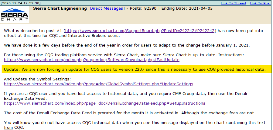 We are no longer as of December 28, 2020 providing the Sierra Chart provided historical data service for CQG or Interactive Brokers users. For more information, refer to this Support Board thread: Jan 1, 2021 Changes to Historical Data: Interactive Brokers, CQG Also refer to this post for steps that you need to do now: Jan 1, 2021 Changes to Historical Data: Interactive Brokers, CQG | Post: 245144 The solution to this problem is to use the Denali Exchange Data Feed for CME and EUREX (Upcoming in January 2021) data. Step-by-step instructions are here: Denali Exchange Data Feed: *Setup Instructions: CME/CBOT/NYMEX/COMEX Exchanges* The first calendar month of this data feed is free. Let us know if you need help with the set up and we will help you through all of the steps. In the case of CQG you will then need to contact your broker and cancel CME and EUREX exchange fees through your CQG account so you do not pay exchange fees twice. You definitively do not have to pay any market data exchange fees through your brokerage account to CQG. This is not required. For other exchanges (ICE, HKFE) you need to use the Sierra Chart Exchange Data Feed: Sierra Chart Exchange Data Feed As an alternative to CQG, we recommend using the Sierra Chart Order Routing Service: Sierra Chart / Trading Technologies Futures Order Routing Service In regards to using CQG provided historical data, we definitely do not recommend using that. It has an additional cost of 25 USD per month. The data delivery is slow and inefficient and causes Sierra Chart to freeze during the processing of it. Only 5 days of tick data is supported from CQG. And only current futures contracts are provided. Whereas with Sierra Chart provided data feeds, you will have access to 10+ years of reliable high-speed delivered tick by tick data. Once again we do not advise using CQG historical data and it will not work well with Sierra Chart. And we also provide no technical help or support for any CQG provided historical data or real-time data. Sierra Chart Support - Engineering Level Your definitive source for support. Other responses are from users. Try to keep your questions brief and to the point. Be aware of support policy: https://www.sierrachart.com/index.php?l=PostingInformation.php#GeneralInformation For the most reliable, advanced, and zero cost futures order routing, use the Teton service: Sierra Chart Teton Futures Order Routing |