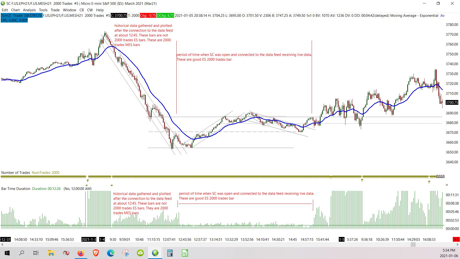 Hi Guys, I did set up my chart (ES-F.US.EPH21) for 2000 trades and I use the MES-F.US.MESH21 as for my <<Trade and Current Quote Symbol>>. When I am connected live, the bars are being completed correctly as ES 2000 trade bars but when it loads the data from historical it creates 2000 trades bar of the MES-F.US.MESH21 instead of ES-F.US.EPH21 bar which I expect to have. I do have 2 screen shot here showing the situation. Can you help me with that ? Tx, ER |