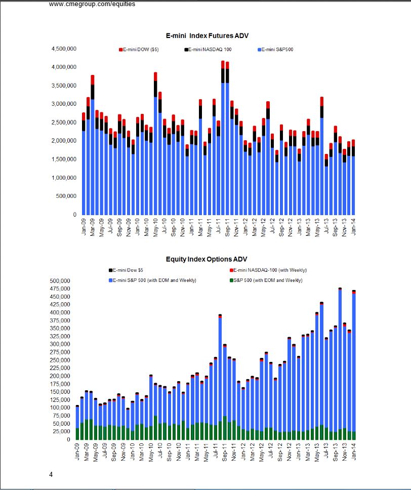 I may soon be switching my Sierra Chart data feed from CTS to Sierra Chart's real-time and historical futures data feed. The only thing that has prevented me from doing this so far is that I now trade weekly futures options rather than the underlying futures contract. The data feed I get with the CTS platform allows me to plot the futures options strikes in Sierra Chart but, as far as I know, Sierra Chart's new data feed currently does not offer that data. My new broker will be TD Ameritrade (account with TD Ameritrade using thinkorswim's execution platform) and my understanding is that the API won't allow me to get any futures related data from them. So, my question is, do you plan on providing CME futures options data (specifically the equity indices) in the near future? When considering this feature, please see the attached image from CME's January 2014 futures equity volume report as an example of where CME's business is heading(more of their monthly reports are here: http://www.cmegroup.com/trading/equity-index/monthly-stock-index-review.html) Thank You Date Time Of Last Edit: 2014-02-20 18:44:36