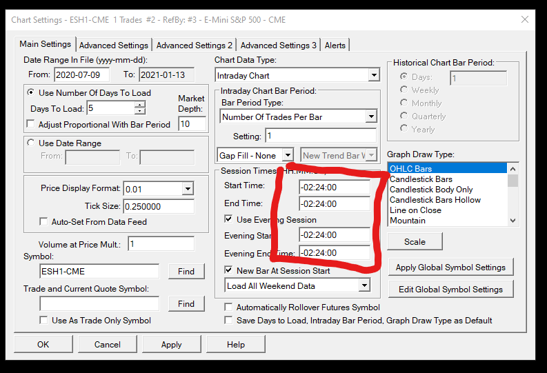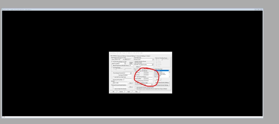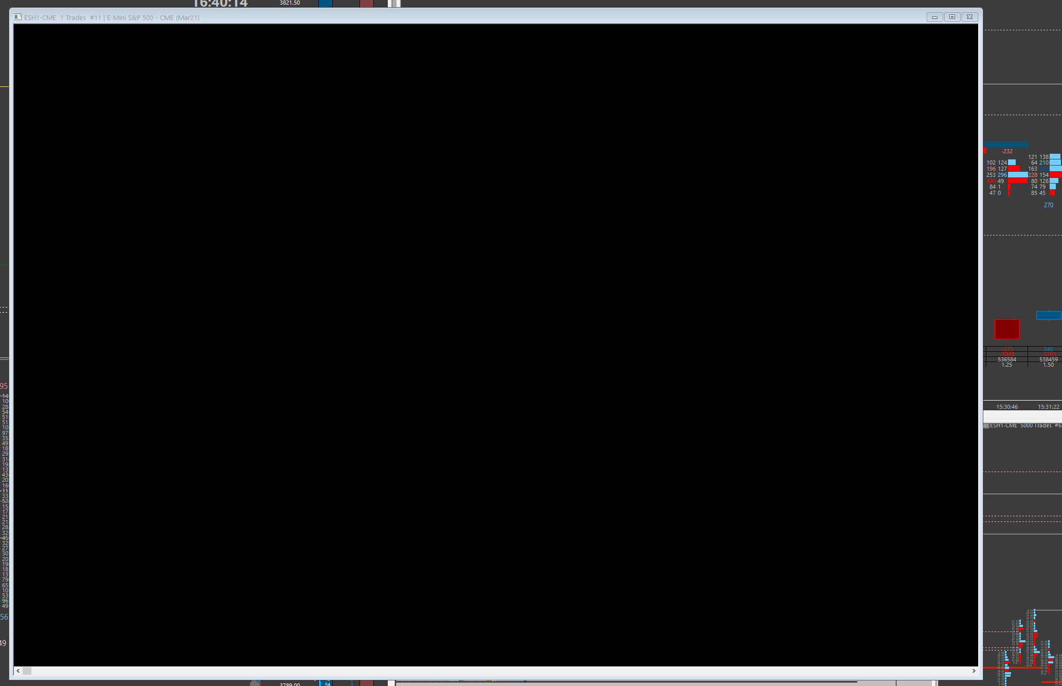 Dear Sierra Chart Team, I'm having problems with an indicator I'm using that's automatically opening a 1-Tick chart in the background and analysing the data. The tick chart opens, but I only get a black screen (see attached picture). I can't even right click the chart to change settings. I also checked the global settings and it is set to 1 Tick refresh rate. The name of the symbol is also the same as every other ES chart I'm using in my chartbook. Don't know how to solve this problem unfortunately. Any chance you could help me out please? |