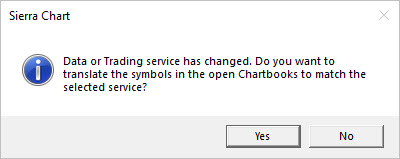 That message comes up because CQG and Sierra Chart symbols are different. Therefore, when you switch between the services, you would need to change the symbols for the selected service. If you are having an issue with the Session Times changing when you are switching symbols, then your Session Times in the Symbol Settings must be different between the two symbols and the option for Global Settings >> Symbol Settings >> Apply Intraday Session Times to Intraday Chart is enabled. You can either update the Session Times to be the same, or disable the option for Apply Intraday Session Times to Intraday Chart. Refer to the following for more information: Global Symbol Settings: Setting of Intraday Chart Session Times For the most reliable, advanced, and zero cost futures order routing, use the Teton service: Sierra Chart Teton Futures Order Routing Date Time Of Last Edit: 2021-01-12 16:08:22