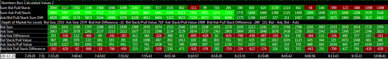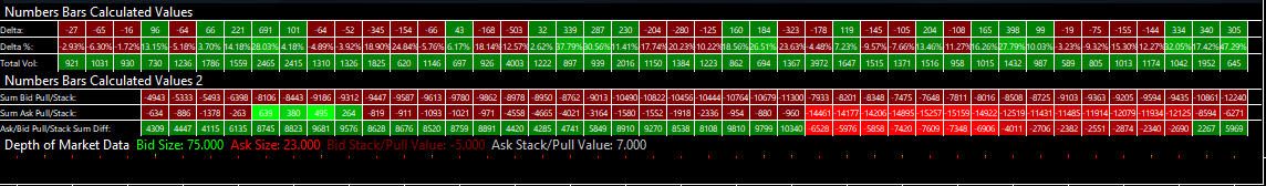 I have seen the Sum Bid/Ask pull/Stack values(see attached) in Numbers Bars Calculated Values 2 already, which means I do have the Pulling/Stacking columns in the DOM, right? I did add Pulling/Stacking to the visible columns (See attached). Or could they be user-defined values? |