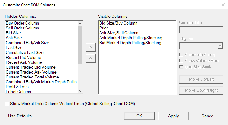 I did set up the Bid/Ask Size Columns visible. But the Bid/ask stack/pull values only exist in that study, not in the DOM. Please see attached, which is what I want. There has to be a way to set it up, cuz I saw it in youtube. |