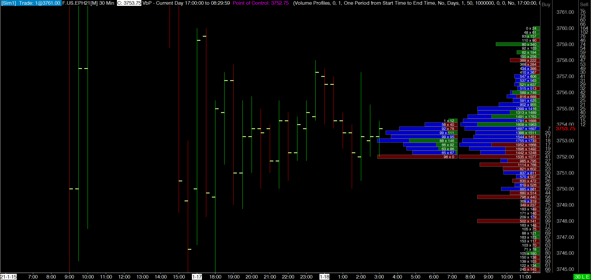 There is a strange issue on the attached chartbook that is configured as per the documentation to display two separate VbPs on the right edge. Each VP is constrained to the session times for RTH and overnight. As I am watching this during the overnight session, the RTH-constrained VbP (Current Day 08:30_00 to 16:59:59) is drawing a new profile at the open of each new chart bar (it's a 30 min chart). http://www.sierrachart.com/image.php?Image=1610961362231.png |